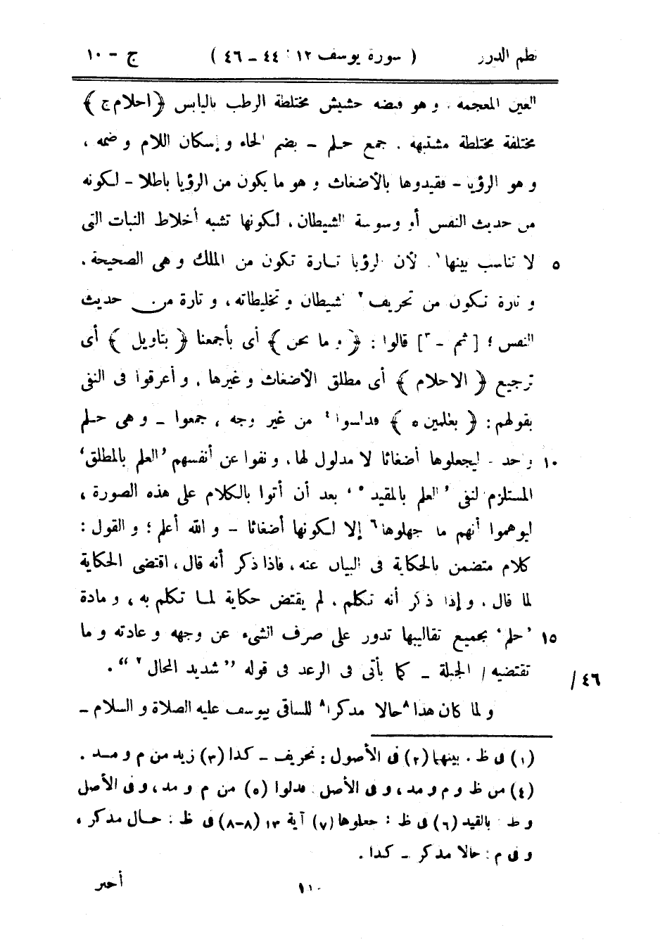الغين المعجمة، وهو قبضه حشيش مختلطة الرطب باليابس {أحلام} مختلفة مشتبهة، جمع حلم - بضم الحاء وإسكان اللام وضمه، وهو الرؤيا - فقيدوها بالأضغاث، وهو ما يكون من الرؤيا باطلاً - لكونه من حديث النفس أو وسوسة الشيطان، لكونها تشبه أخلاط النبات التي لا تناسب بينها، لأن الرؤيا تارة تكون من الملك وهي الصحيحة، وتارة تكون من تحريف الشيطان وتخليطاته، وتارة من حديث النفس؛ ثم قالوا: {وما نحن} أي بأجمعنا {بتأويل} أي ترجيع {الأحلام} أي مطلق الأضغاث وغيرها، وأعرقوا في النفي بقولهم: {بعالمين *} فدلسوا من غير وجه، جمعوا - وهي حلم واحد - ليجعلوها أضغاثاً لا مدلول لها، ونفوا عن أنفسهم «العلم المطلق» المستلزم لنفي «العلم بالمقيد» بعد أن أتوا بالكلام على هذه الصورة، ليوهموا أنهم ما جهلوها إلا لكونها أضغاثاً - والله أعلم؛ والقول: كلام متضمن بالحكاية في البيان عنه، فإذا ذكر أنه قال، اقتضى الحكاية لما قال، وإذا ذكر أنه تكلم، لم يقتض حكاية لما تكلم به، ومادة «حلم» بجميع تقاليبها تدور على صرف شيء عن وجهه وعادته وما تقتضيه الجبلة - كما يأتي في الرعد في قوله: {شديد المحال} [الرعد: 13] .