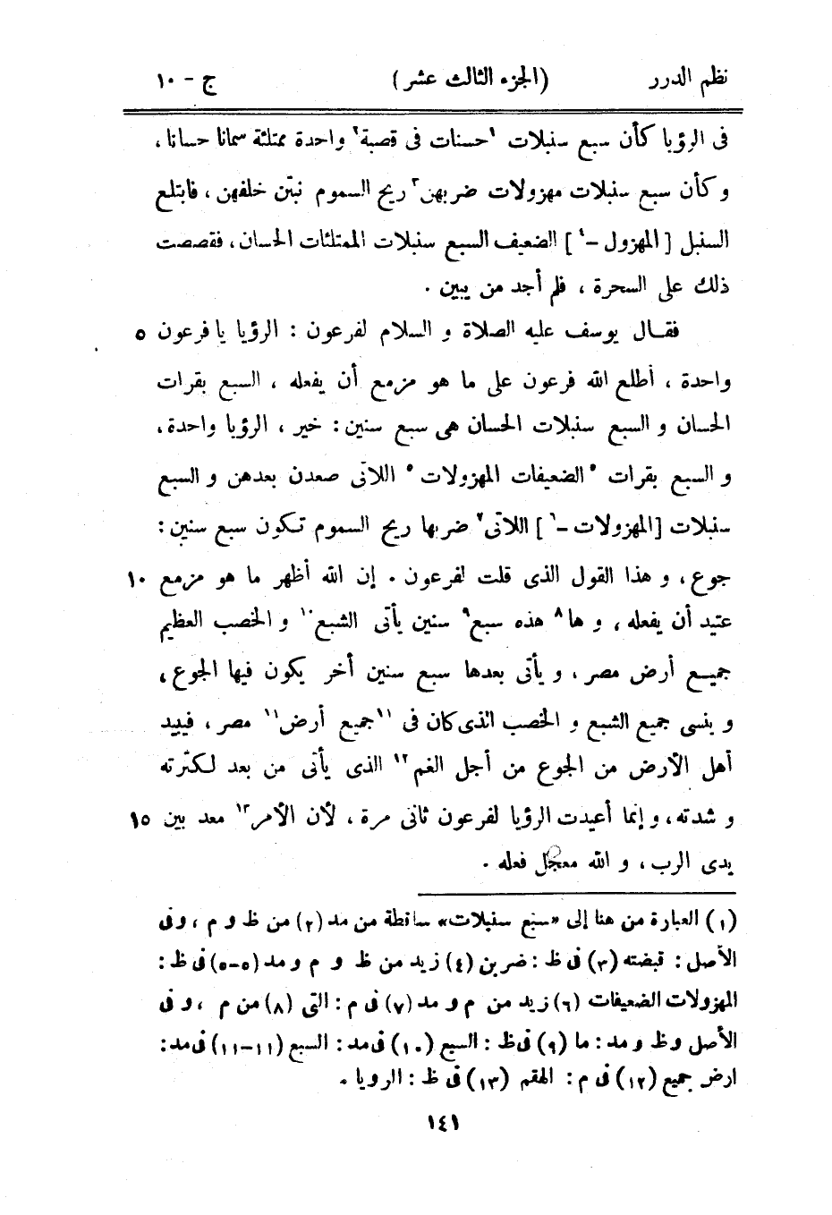 فقال يوسف عليه الصلاة والسلام لفرعون: الرؤيا يا فرعون واحدة، أطلع الله فرعون على ما هو مزيع أن يفعله، السبع بقرات الحسان والسبع سنبلات الحسان هي سبع سنين: خير، الرؤيا واحدة، والسبع بقرات الضعيفات المهزولات اللاتي صعدان بعدهن والسبع سنبلات المهزولات اللاتي ضربها ريح السموم تكون سبع سنين: جوع، وهذا القول الذي قلت لفرعون.
