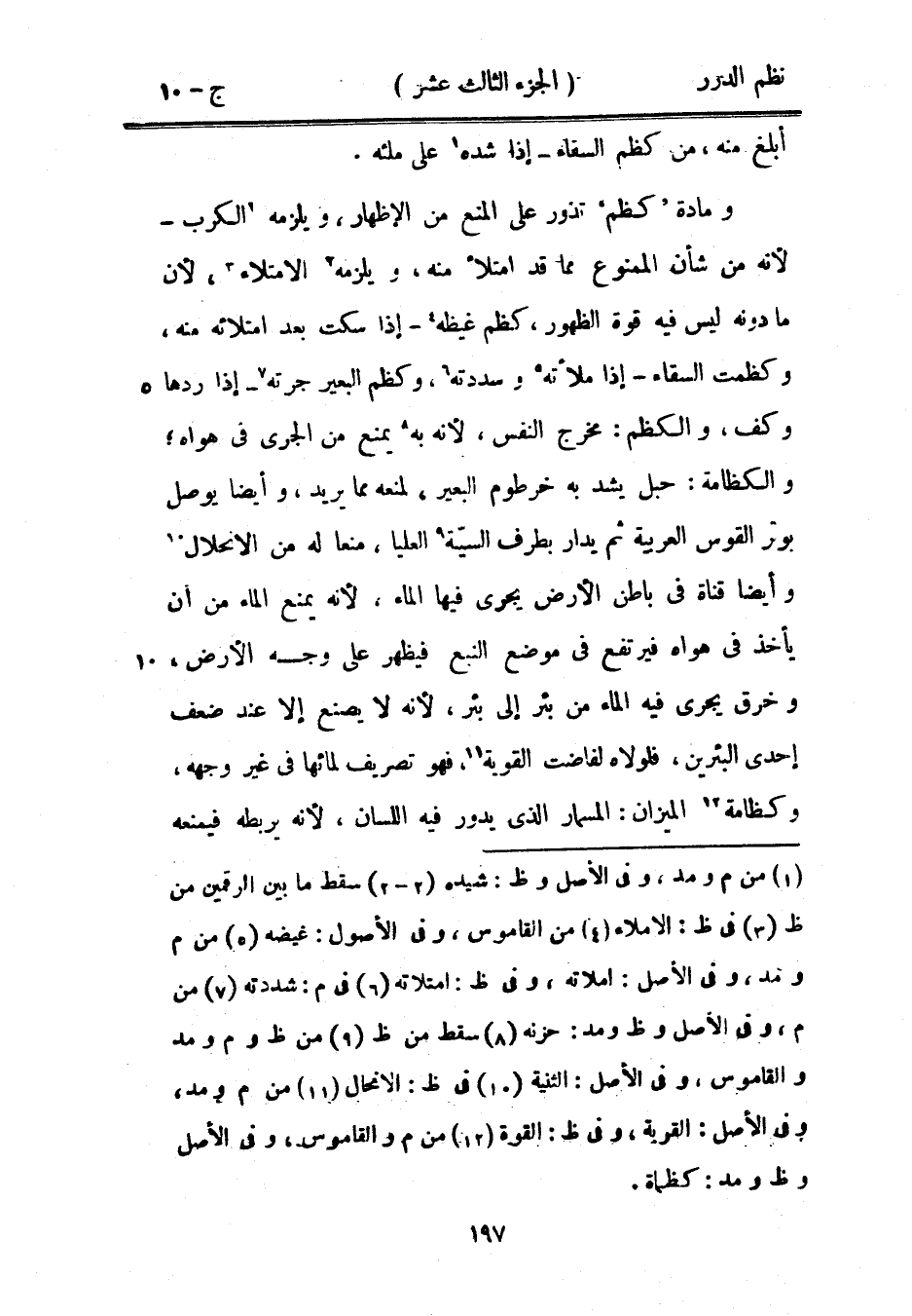 ومادة «كظم» تدور على المنع من الإظهار، يلزمه الكرب - لأنه من شأن الممنوع مما قد امتلأ منه، ويلزمه الامتلاء، لأن ما دونه ليس فيه قوة الظهور، كظم غيظه -إذا سكت بعد امتلائه منه، وكظمت السقاء - إذا ملأته وسددته، وكظم البعير جرته - إذا ردها وكف، والكظم: مخرج النفس، لأنه به يمنع من الجري في هواه؛ والكظامة: حبل يشد به خرطوم البعير، لمنعه مما يريد، وأيضاً يوصل بوتر القوس العربية ثم يدار بطرف السية العليا، منعاً له من الانحلال وأيضاً قناة في باطن الأرض يجري فيهما الماء، لأنه يمنع الماء من أن يأخذ في هواه فيرتفع في موضع النبع فيظهر على وجه الأرض، وخرق يجري فيه الماء من بئر إلى بئر، لأنه لا يصنع إلا عند ضعف إحدى البئرين، فلولاه لفاضت القوية، فهو تصريف لمائها في غير وجهه، وكظامة الميزان: المسمار الذي يدور فيه اللسان، لأنه يربطه فيمنعه