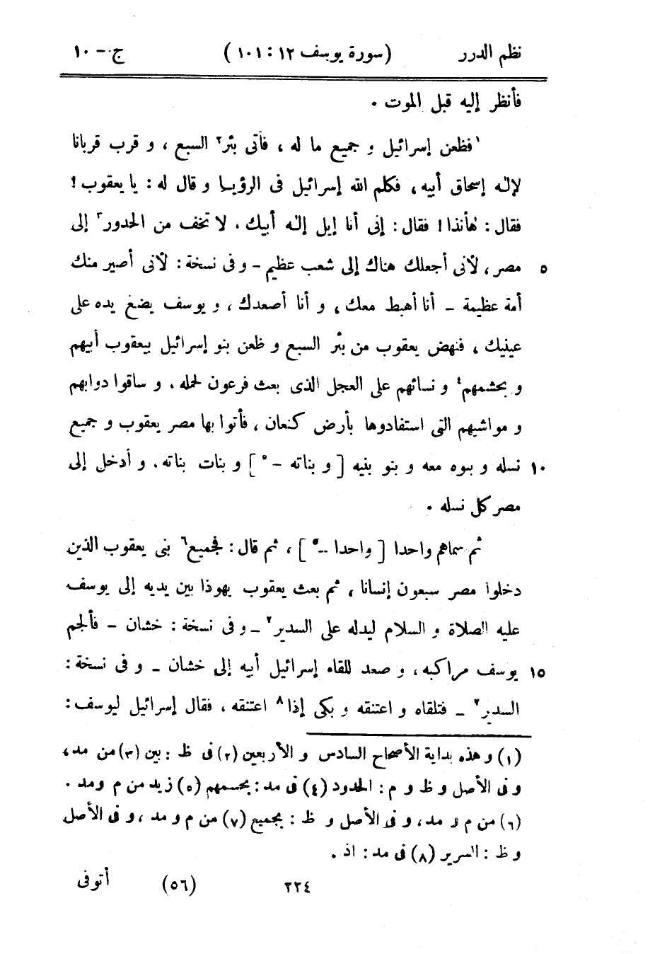 ثم سماهم واحداً واحداً، ثم قال: فجميع بني يعقوب الذين ادخلوا مصر سبعون إنساناً، ثم بعث يعقوب يهوذا بين يديه إلى يوسف عليه الصلاة والسلام ليدله على السدير - وفي نسخة: خشان - فألجم يوسف مراكبه، وصعد للقاء أسرائيل أبيه إلى خشان - وفي نسخة: السدير - فتلقاه واعتنقه وبكى إذ اعتنقه، فقال إسرائيل ليوسف: