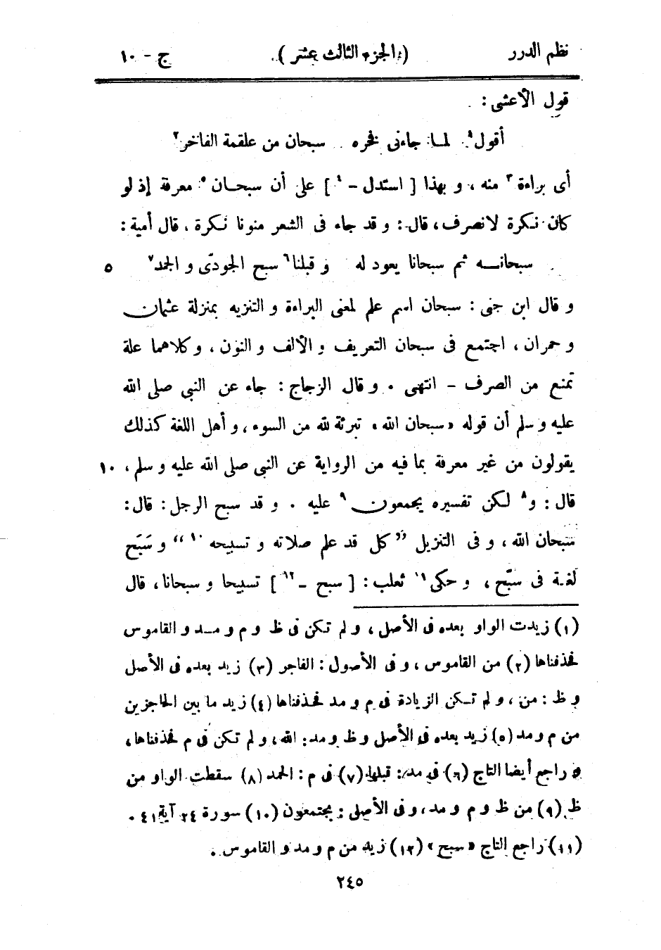 وقال ابن جني: سبحان اسم علم لمعنى البراءة والتنزيه بمنزلة عثمان وحمران، اجتمع في سبحان التعريف والألف والنون، وكلاهما علة تمنع من الصرف - انتهى. وقال الزجاج: جاء عن النبي صَلَّى اللهُ عَلَيْهِ وَسَلَّمَ أن قوله «سبحان الله» تبرئة لله من السوء، وأهل اللغة كذلك يقولون من غير معرفة بما فيه من الرواية عن النبي صَلَّى اللهُ عَلَيْهِ وَسَلَّمَ قال: ولكن تفسيره يجمعون عليه، وقد سبح الرجل: قال سبحان الله، وفي التنزيل {كل قد علم صلاته وتسبيحه} [النور: 41] وسبح لغة في سبّح، وحكى ثعلب: سبح تسبيحاً وسبحاناً، قال