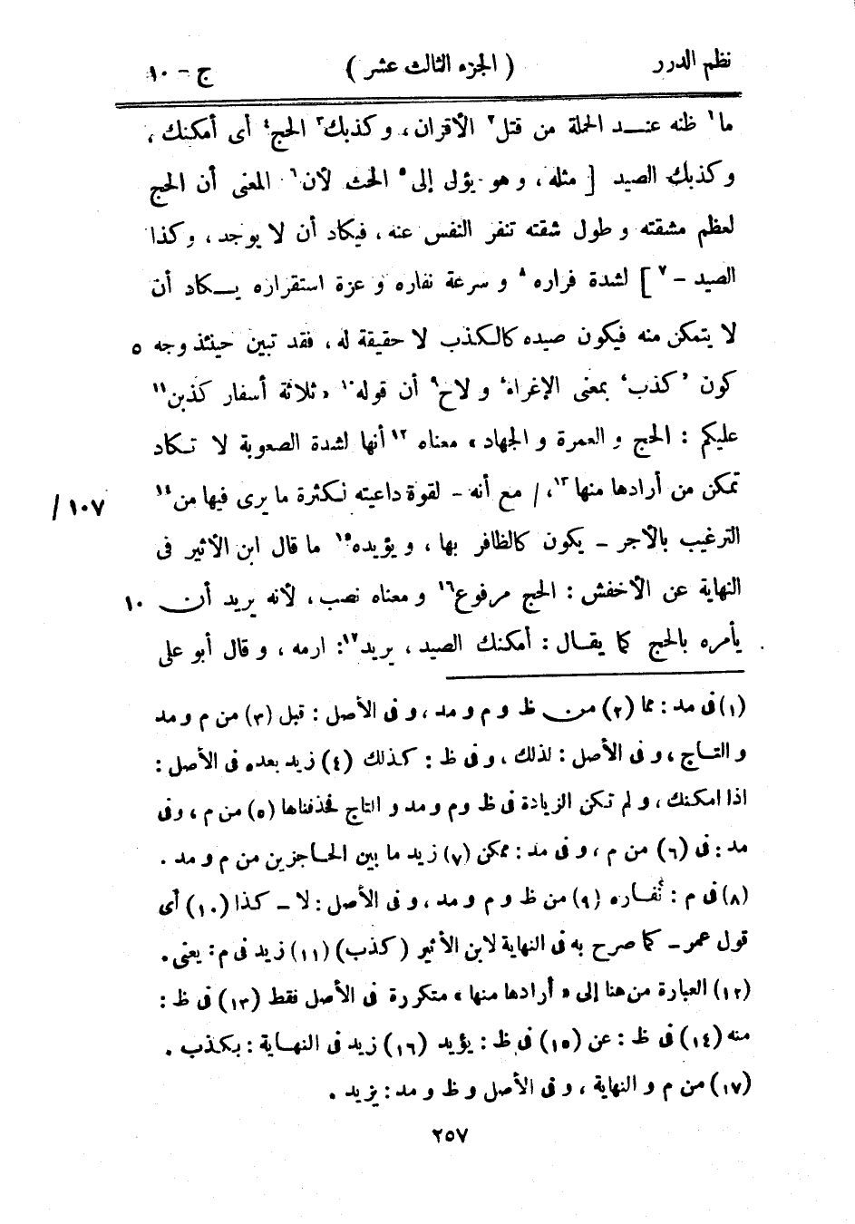 ما ظنه عند الحملة من قتل الأقران، وكذبك الحج أي أمكنك وكذبك الصيد مثله، وهو يؤول إلى الحث لأن المعنى أن الحج لعظم مشقته وطول شقته تنفر النفس عنه، فيكاد أن لا يوجد، وكذا الصيد لشدة فراره وسرعة نفاره وعزة استقراره يكاد أن لا يتمكن منه فيكون صيده كالكذب لا حقيقة له، فقد تبين حينئذ وجه كون «كذب» بمعنى الإغراء ولاح أن قوله «ثلاثة أسفار كذبن عليكم: الحج والعمرة والجهاد» معناه أنها لشدة الصعوبة لا تكاد تمكن من أرادها منها، مع أنه - لقوة داعيته لكثرة ما يرى فيها من الترغيب بالأجر - يكون كالظافر بها، ويؤيده ما قال ابن الأثير في النهاية عن الأخفش: الحج مرفوع ومعناه نصب، لأنه يريد أن يأمره بالحج كما يقال: أمكنك الصيد، يريد: ارمه، وقال أبو علي