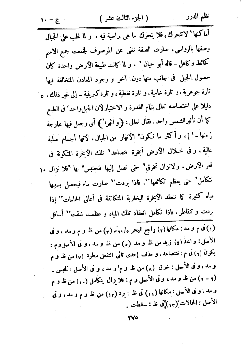 أماكنها لا تتحرك، فلا يتحرك ما هي راسية فيه. ولما غلب على الجبال وصفها بالرواسي، صارت الصفة تغني عن الموصوف فجمعت جمع الاسم كحائط وكاهل - قاله أبو حيان، ولما كانت طبيعة الأرض واحدة كان حصول الجبل في جانب منها دون آخر ووجود المعادن المتخالفة فيها تارة جوهرية، وتارة خامية، وتارة نفطية، وتارة كبريتية - إلى غير ذلك، دليلاً على اختصاصه تعالى بتمام القدرة والاختيار لأن الجبل واحد في الطبع كما أن تأثير الشمس واحد، فقال تعالى: {وأنهاراً} أي وجعل فيها خارجة منها، وأكثر ما تكون الأنهار من الجبال، لأنها أجسام صلبة عالية، وفي خلال الأرض أبخرة فتصاعد تلك الأبخرة المتكونة في قعر الأرض، ولا تزال تخرق حتى تصل إليها فتحتبس بها فلا تزال تتكامل حتى يعظم تكاثفها، فإذا بردت صارت ماء فيحصل بسببها مياه كثيرة كما تنعقد الأبخرة البخارية المتكاثفة في أعالي الحمامات إذا بردت وتتقاطر، فإذا تكامل انعقاد تلك المياه وعظمت شقت أسافل