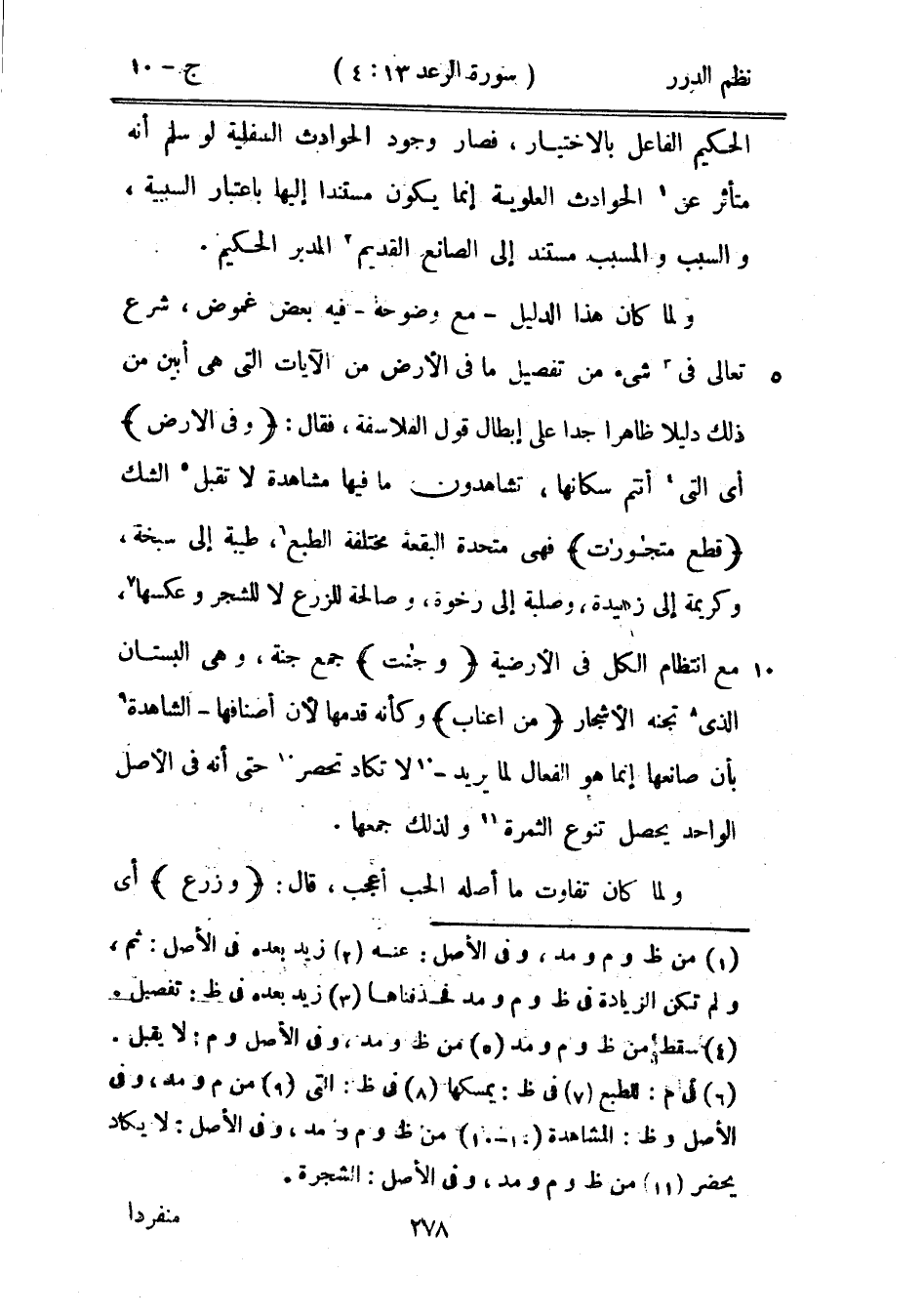 ولما كان الدليل - مع وضوحه - فيه بعض غموض، شرع تعالى في شيء من تفصيل ما في الأرض من الآيات التي هي أبين من ذلك دليلاً ظاهراً جداً على إبطال قول الفلاسفة، فقال: {وفي الأرض} أي التي أنتم سكانها، تشاهدون ما فيها مشاهدة لا تقبل الشك {قطع متجاورات} فهي متحدة البقعة مختلفة الطبع، طيبة إلى سبخة، وكريمة إلى زهيدة، وصلبة إلى رخوة، وصالحة للزرع لا للشجر وعكسها، ومع انتظام الكل في الأرضية {وجنات} جمع جنة، وهي البستان الذي تجنه الأشجار {من أعناب} وكأنه قدمها لأن أصنافها - الشاهدة بأن صانعها إنما هو الفعال لما يريد - لا تكاد تحصر حتى أنه في الأصل الواحد يحصل تنوع الثمرة ولذلك جمعها.