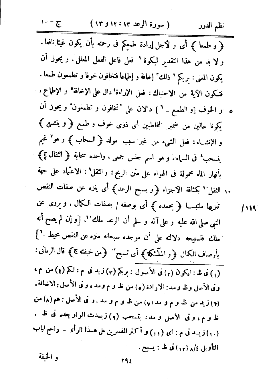 {وطمعاً} أي ولأجل إرادة طمعكم في رحمته بأن يكون غيثاً نافعاً، ولا بد من هذا التقدير ليكونا فعل فاعل الفعل المعلل، ويجوز أن يكون المعنى: يريكم ذلك إخافة وإطماعاً فتخافون خوفاً وتطمعون طمعاً، فتكون الآية من الاحتباك: فعل الإراءة دال على الإخافة والإطماع، والخوف والطمع دالان على «تخافون وتطمعون» ويجوز أن يكونا حالين من ضمير المخاطبين أي ذوي خوف وطمع {وينشىء} والإنشاء: فعل الشيء من غير سبب مولد {السحاب} وهو غيم ينسحب في السماء، وهو اسم جنس جمعي، واحده سحابه {الثقال *} بأنهار الماء محمولة في الهواء على متن الريح؛ والثقل: الاعتماد على جهة الثقل بكثافة الأجزاء {ويسبح الرعد} أي ينزه عن صفات النقص تنزيهاً ملتبساً {بحمده} أي بوصفه بصفات الكمال، ويروى عن النبي صلى الله عليه وعلى آله وسلم أن الرعد ملك وإن لم يصح أنه ملك فتسبيحه دلالته على أن موجده سبحانه منزه عن النقص محيط بأوصاف الكمال {والملائكة} أي تسبح {من خيفته} قال الرماني: