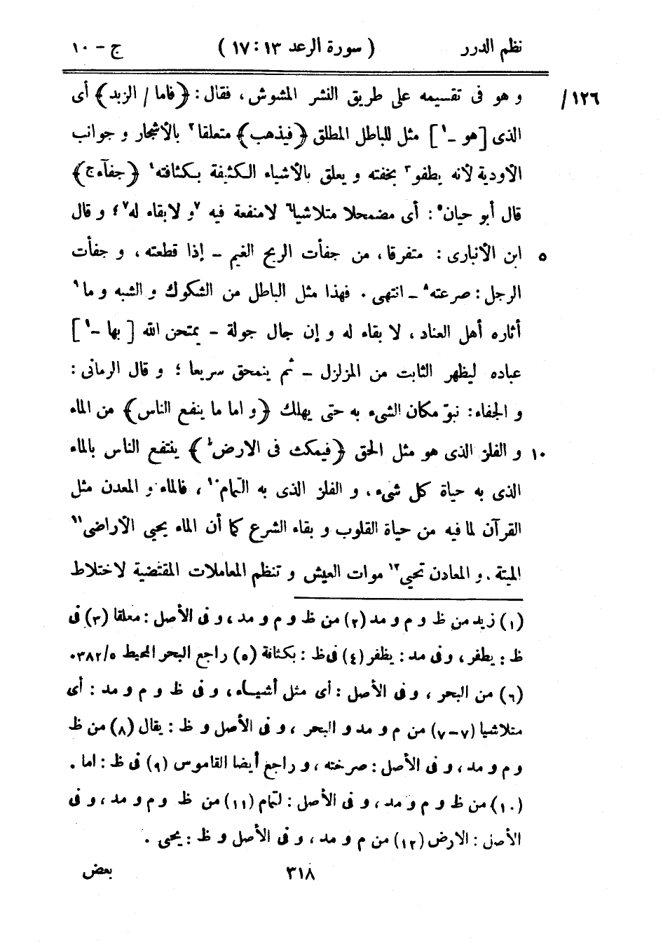 وهو في تقسيمه على طريق النشر المشوش، فقال: {فأما الزبد} أي الذي هو مثل للباطل المطلق {فيذهب} متعلقاً بالاشجار وجوانب الأودية لأنه يطفو بخفته ويعلق بالأشياء الكثيفة بكثافته {جفاء} قال أبو حيان: أي مضمحلاً متلاشياً لا منفعة فيه ولا بقاء له؛ وقال ابن الأنباري: متفرقاً، من جفأت الريح الغيم - إذا قطعته، وجفأت الرجل: صرعته - انتهى. فهذا مثل الباطل من الشكوك والشبه وما أثاره أهل العناد، لا بقاء له وإن جال جولة - يمتحن الله بها عباده ليظهر الثابت من المزلزل - ثم ينمحق سريعاً؛ وقال الرماني: والجفاء: بنوّ مكان الشيء به حتى يهلك {وأما ما ينفع الناس} من الماء والفلز الذي هو مثل الحق {فيمكث في الأرض} ينتفع الناس بالماء الذي به حياة كل شيء، والفلز الذي به التمام، فالماء والمعدن مثل القرآن لما فيه من حياة القلوب وبقاء الشرع كما أن الماء يحيى الأراضي الميتة، والمعادن تحيي موات العيش وتنظم المعاملات المقتضية لاختلاط