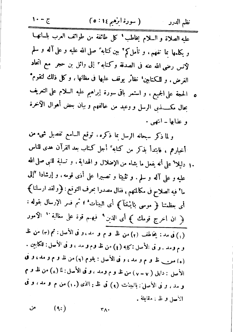 يخاطب كل طائفة من طوائف العرب بلسانها ويكلمها بما تفهم، وتأمل كم بين كتابه صلى الله عليه وعلى آله وسلم لأنس رضي الله عنه في الصدقة وكتابه إلى وائل بن حجر مع اتحاد الغرض، وللكتابين نظائر يوقف عليها في مظانها، وكل ذلك لتقوم الحجة على الجميع، واستمر باقي سورة إبراهيم عليه السلام على التعريف بحال مكذبي الرسل ووعيد من خالفهم وبيان بعض أهوال الآخرة وعذابها - انتهى.