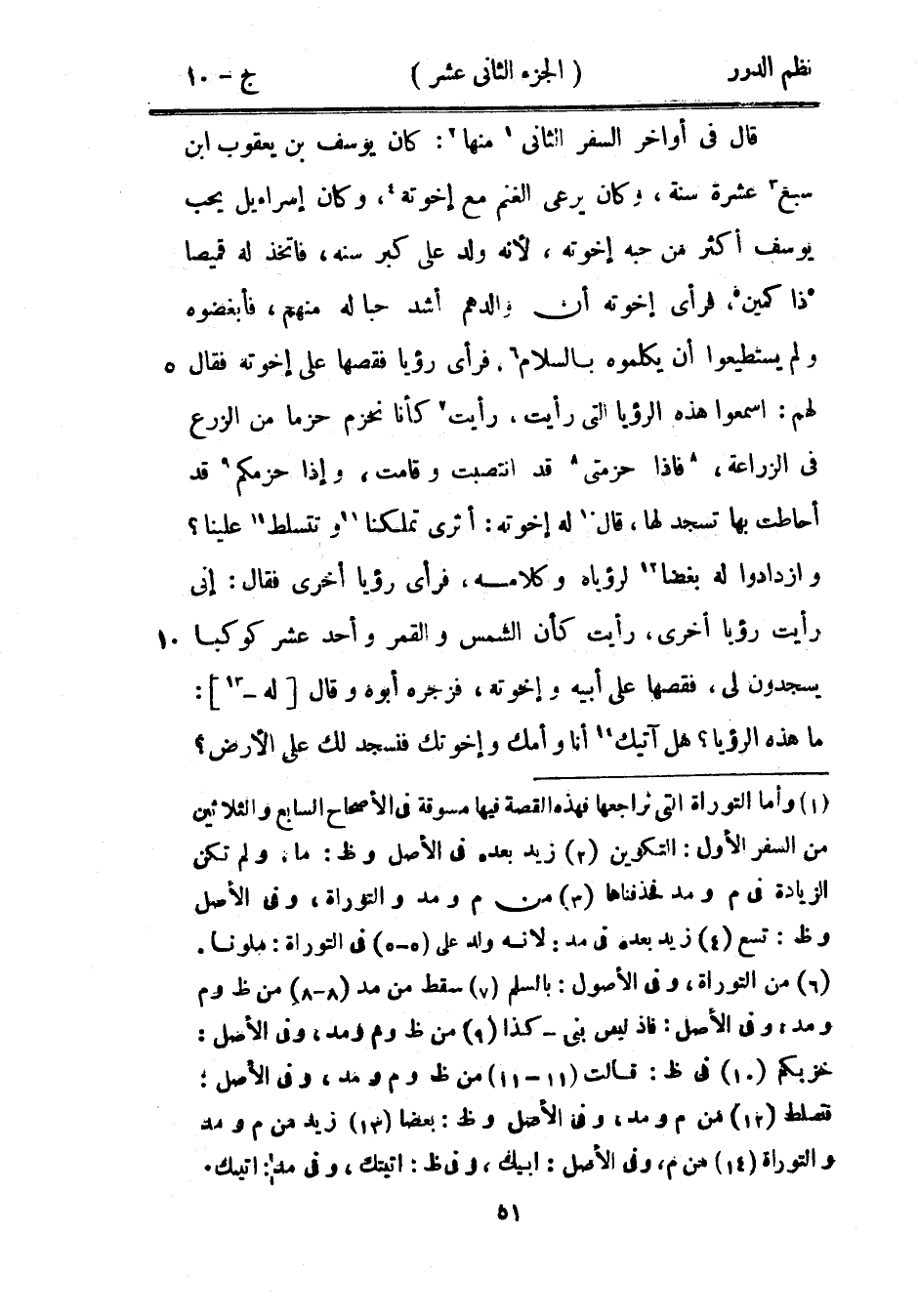 قال في أواخر السفر الثاني منها: كان يوسف بن يعقوب ابن سبع عشرة سنه، وكان يرعى الغنم مع إخوته، وكان إسرائيل يحب يوسف أكثر من حبه إخوته، لأنه ولد على كبر سنه، فاتخذ له قميصاً ذا كمين، فرأى إخوته أن والدهم أشد حباً له منهم، فأبغضوه ولم يستطيعوا أن يكلموه بالسلام، فرأى رؤيا قصها على إخوته فقال لهم: اسمعوا هذه الرؤيا التي رأيت، رأيت كأنا نحزم حزماً من الزرع في الزراعة، فإذا حزمتي قد انتصبت وقامت، وإذا حزمكم قد أحاطت بها تسجد لها، قال له إخوته: أترى تملكنا وتتسلط علينا؟ وازدادوا له بغضاً لرؤياه وكلامه، فرأى رؤيا أخرى فقال: إني رأيت رؤيا أخرى، رأيت كأن الشمس والقمر وأحد عشر كوكباً يسجدون لي، فقصها على أبيه وإخوته، فزجره أبوه وقال له: ما هذه الرؤيا؟ هل آتيك أنا وأمك وإخوتك فنسجد لك على الأرض؟