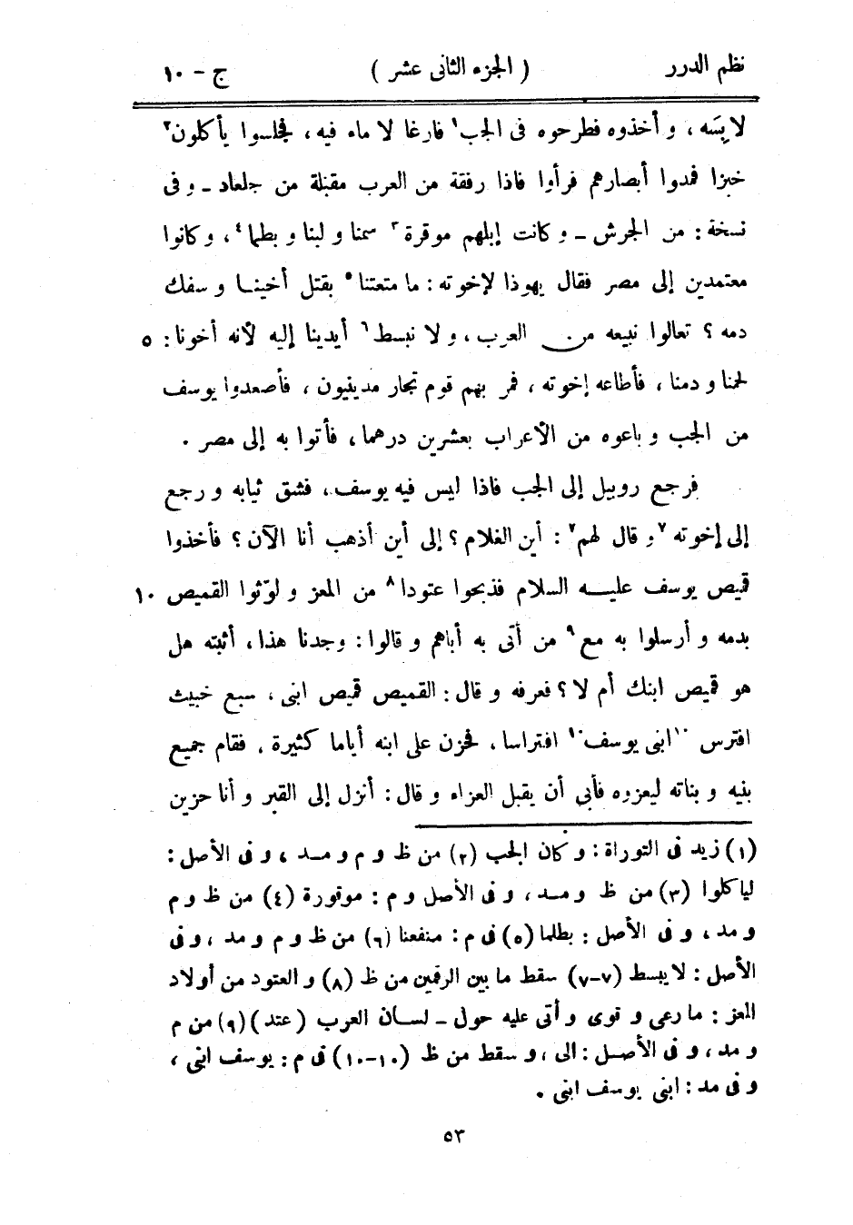 لابِسَه، وأخذوه فطرحوه في الجب فارغاً لا ماء فيه، فجلسوا يأكلون خبزاً فمدوا أبصارهم فرأوا فإذا رفقة من العرب مقبلة من جلعاد - وفي نسخة: من الجرش - وكانت إبلهم موقرة سمناً ولبناً وبطماً، وكانوا معتمدين إلى مصر فقال يهوذا لإخوته: ما متعتنا بقتل أخينا وسفك دمه؟ تعالوا نبيعه من العرب، ولا نبسط أيدينا إليه لأنه أخونا: لحمنا ودمنا، فأطاعه إخوته، فمر بهم قوم تجار مدينيون، فأصعدوا يوسف من الجب وباعوه من الأعراب بعشرين درهماً، فأتوا به إلى مصر.