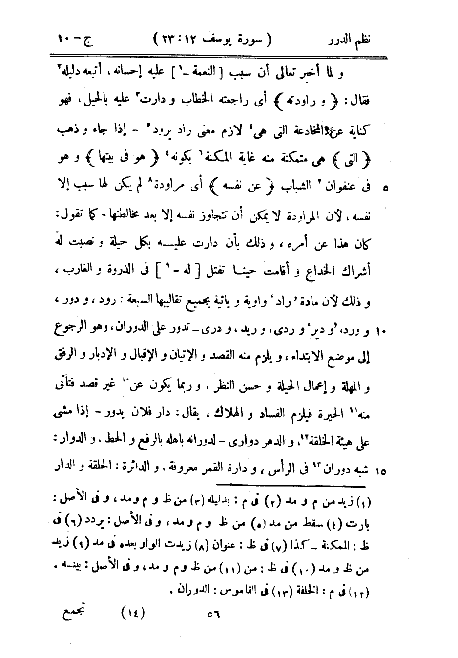 ولما أخبر تعالى أن سبب النعمة عليه إحسانه، أتبعه دليله فقال: {وراودته} أي راجعته الخطاب ودارت عليه بالحيل، فهو كناية عن المخادعة التي هي لازم معنى راد يرود - إذا جاء وذهب {التي} هي متمكنة منه غاية المكنة بكونه {هو في بيتها} وهو في عنفوان الشباب {عن نفسه} أي مراودة لم تكن لها سبب إلا نفسه، لأن المراودة لا يمكن أن تتجاورز نفسه إلاّ بعد مخالطتها - كما تقول: كان هذا عن أمره، وذلك بأن دارت عليه بكل حيلة ونصبت له أشراك الخداع وأقامت حيناً تفتل له في الذروة والغارب، وذلك لأن مادة «راد» واوية ويائية بجميع تقاليبها السبعة: رود، ودور، وورد، «ودير» وردي، وريد، ودري - تدور على الدوران، وهو الرجوع إلى موضع الابتداء، ويلزم منه القصد والإتيان والإقبال والإدبار والرفق والمهلة وإعمال الحيلة وحسن النظر، وربما يكون عن غير قصد فتأتي منه الحيرة فيلزم الفساد والهلاك، يقال: دار فلان يدور - إذا مشى على هيئة الخلقة، والدهر دواري - لدورانه باهله بالرفع والحط، والدوار: شبه دوران في الرأس، ودارة القمر معروفة، والدائرة: الحلقة والدار
