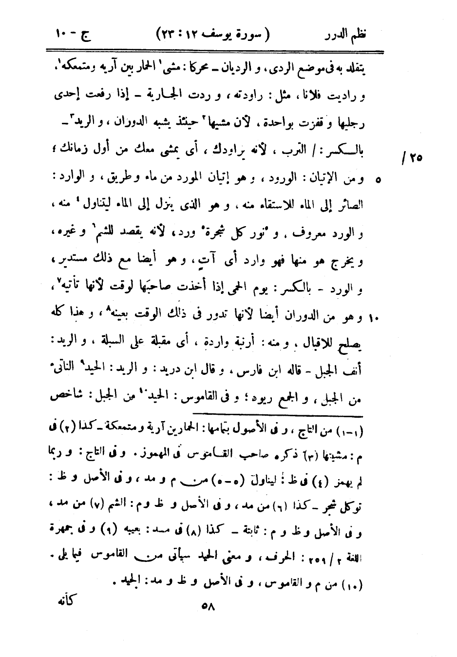 يتقلد به في موضع الردى، والرديان - محركاً: مشى الحمار بين آريه ومتمعكه، وراديت فلاناً، مثل: راودته، وردت الجارية - إذا رفعت إحدى رجليها وقفزت بواحدة، لأت مشيها حينئذٍ يشبه الدوران، والريد - بالكسر: الترب، لأنه يراودك، أي يمشي معك من أول زمانك؛ ومن الإتيان: الورود، وهو إتيان المورد من ماء وطريق، والوارد: الصائر إلى الماء للاستقاء منه، وهو الذي ينزل إلى الماء ليتناول منه، والورد معروف، ونور كل شجرة ورد، لأنه يقصد للشم وغيره، ويخرج هو منها فهو وارد أي آتٍ، وهو أيضاً مع ذلك مستدير، والورد - بالكسر: يوم الحمى إذا أخذت صاحبَها لوقت لأنها تأتيه، وهو من الدوران أيضاً لأنها تدور في ذلك الوقت بعينه، وهذا كله يصلح للإقبال، ومنه: أرنبة واردة، أي مقبلة على السبلة، والريد: أنف الجبل - قاله ابن فارس، وقال ابن دريد: والريد: الحيد الناتىء من الجبل، والجمع ريود؛ وفي القاموس: الحيد من الجبل شاخص