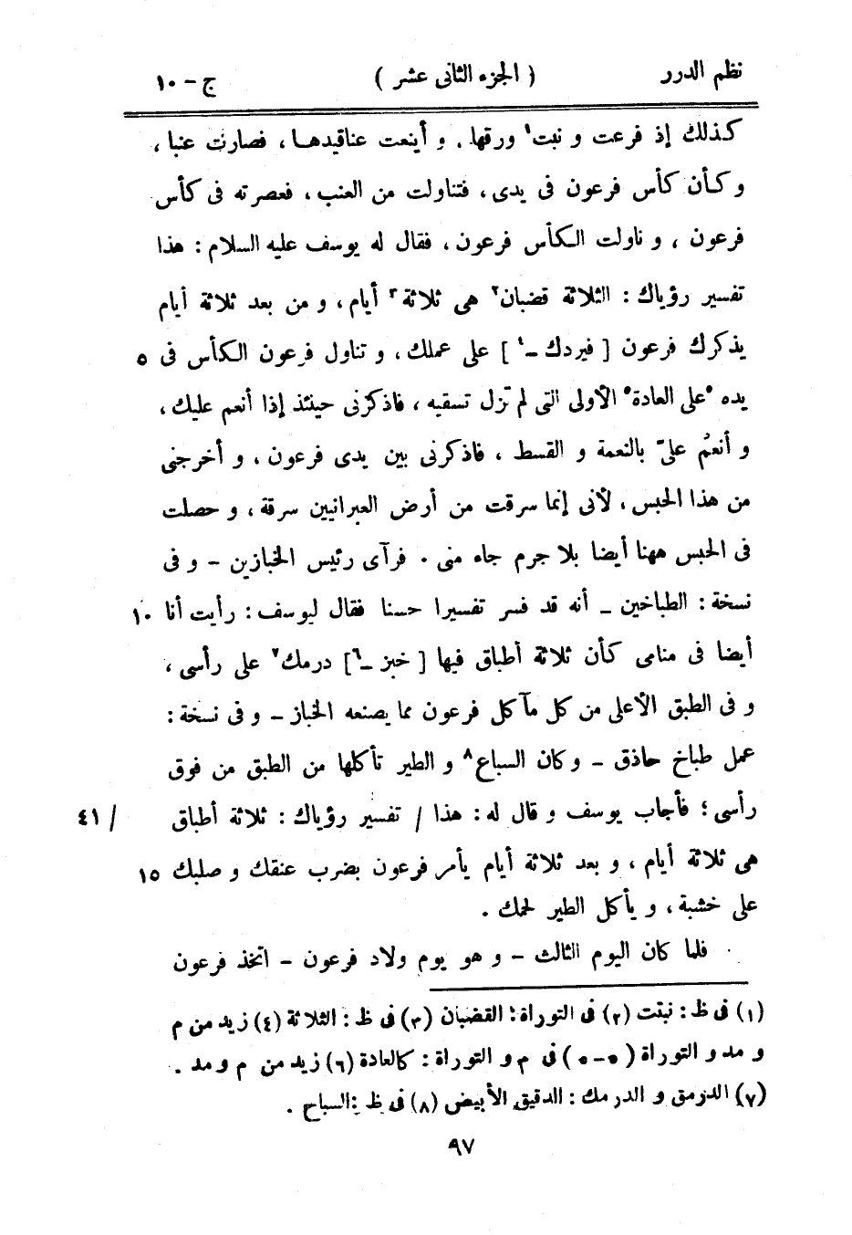 كذلك إذ فرعت ونبت ورقها، وأينعت عناقيدها، فصارت عنباً، وكأن كأس فرعون في يدي، فتناولت من العنب، فعصرته في كأس فرعون، وناولت الكأس فرعون، فقال له يوسف عليه السلام: هذا تفسير رؤياك: الثلاثة قضبان هي ثلاثة أيام، ومن بعد ثلاثة أيام يذكرك فرعون فيردك على عملك، وتناول فرعون الكأس في يده على العادة الأولى التي لم تزل تسقيه، فاذكرني حينئذ إذا أنعم عليك، وأنعم عليّ بالنعمة والقسط، فاذكرني بين يدي فرعون، وأخرجني من هذا الحبس، لأني إنما سرقت من أرض العبرانين سرقة، وحصلت في الحبس هاهنا أيضاً بلا جرم جاء مني. فرأى رئيس الخبازين - وفي نسخة: الطباخين - أنه قد فسر تفسيراً حسناً فقال يوسف: رأيت أنا أيضاً في منامي كأن ثلاثة أطباق فيها خبز درمك على رأسي، وفي الطبق الأعلى من كل مآكل فرعون مما يصنعه الخباز - وفي نسخة: عمل طباخ حاذق - وكان السباع والطير تأكلها من الطبق من فوق رأسي؛ فأجاب يوسف وقال له: هذا تفسير رؤياك: ثلاثة أطباق هي ثلاثة أيام، وبعد ثلاثة أيام يأمر فرعون بضرب عنقك وصلبك على خشبة، ويأكل الطير لحمك.