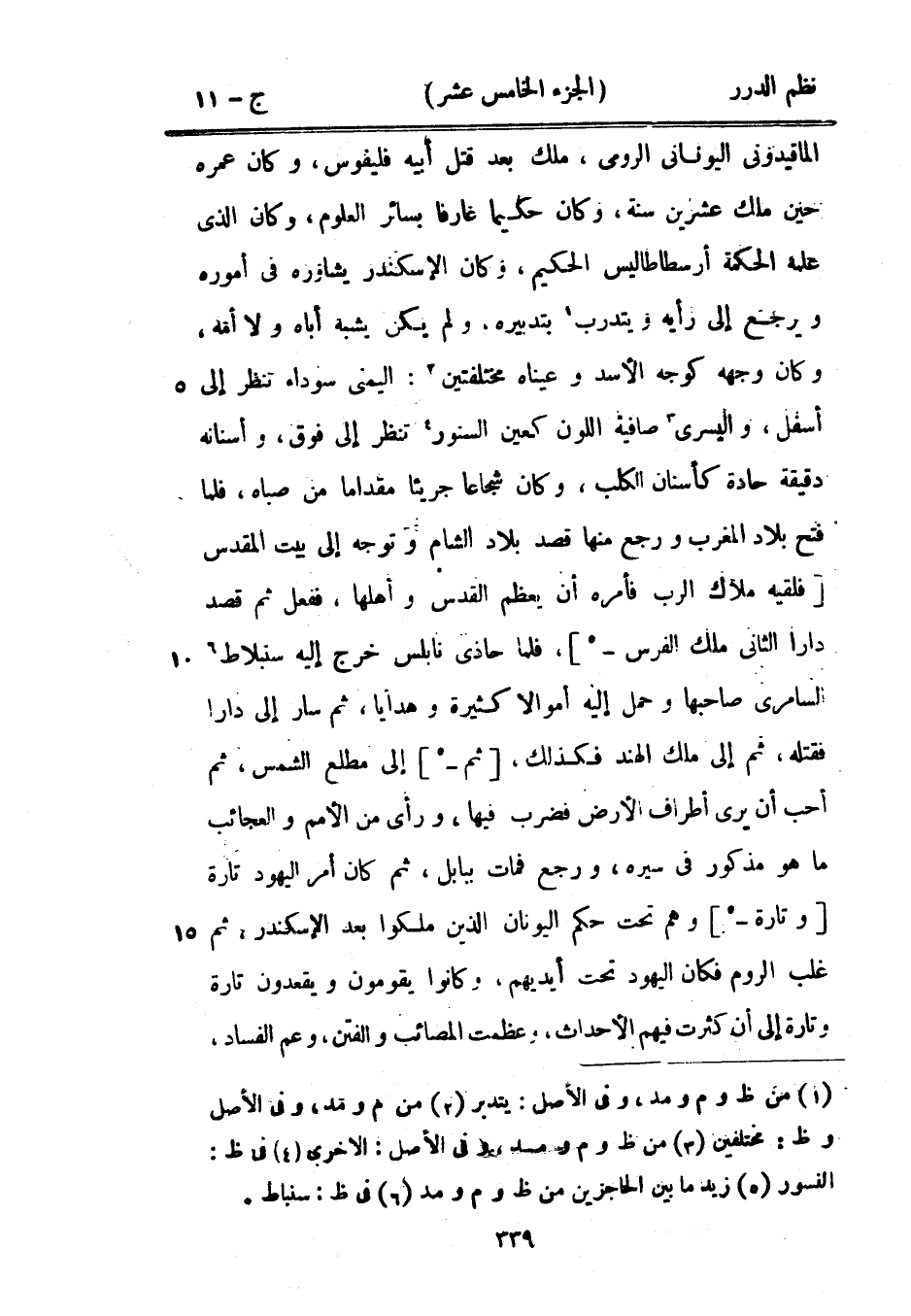 الماقيدوني اليوناني الرومي، ملك بعد قتل أبيه فليفوس، وكان عمره حين ملك عشرين سنة، وكان حكيماً عارفاً بسائر العلوم، وكان الذي علمه الحكمة أرسطاطاليس الحكيم، وكان الإسكندر يشاوره في أموره ويرجع إلى رأيه ويتدرب بتدبيره، ولم يكن يشبه أباه ولا أمه، وكان وجهه كوجه الأسد وعيناه مختلفتين: اليمنى سوداء تنظر إلى أسفل، واليسرى صافية اللون كعين السنور تنظر إلى فوق، وأسنانه دقيقة حادة كأسنان الكلب، وكان شجاعاً جريئاً مقداماً من صباه، فلما فتح بلاد المغرب ورجع منها قصد بلاد الشام وتوجه إلى بيت المقدس فلقيه ملاك الرب فأمره أن يعظم القدس وأهلها، ففعل ثم قصد دارا الثاني ملك الفرس، فلما حاذى نابلس خرج إليه سنبلاط السامري صاحبها وحمل إليه أموالاً كثيرة وهدايا، ثم سار إلى دارا فقتله، ثم إلى ملك الهند فكذلك، ثم إلى مطلع الشمس، ثم أحب أن يرى أطراف الأرض فضرب فيها، ورأى من الأمم والعجائب ما هو مذكور في سيره، ورجع فمات ببابل، ثم كان أمر اليهود تارة وتارة وهم تحت حكم اليونان الذين ملكوا بعد الإسكندر، ثم غلب الروم فكان اليهود تحت أيديهم، وكانوا يقومون ويقعدون تارة وتارة إلى أن كثرت فيهم الأحداث، وعظمت المصائب والفتن، وعم الفساد،