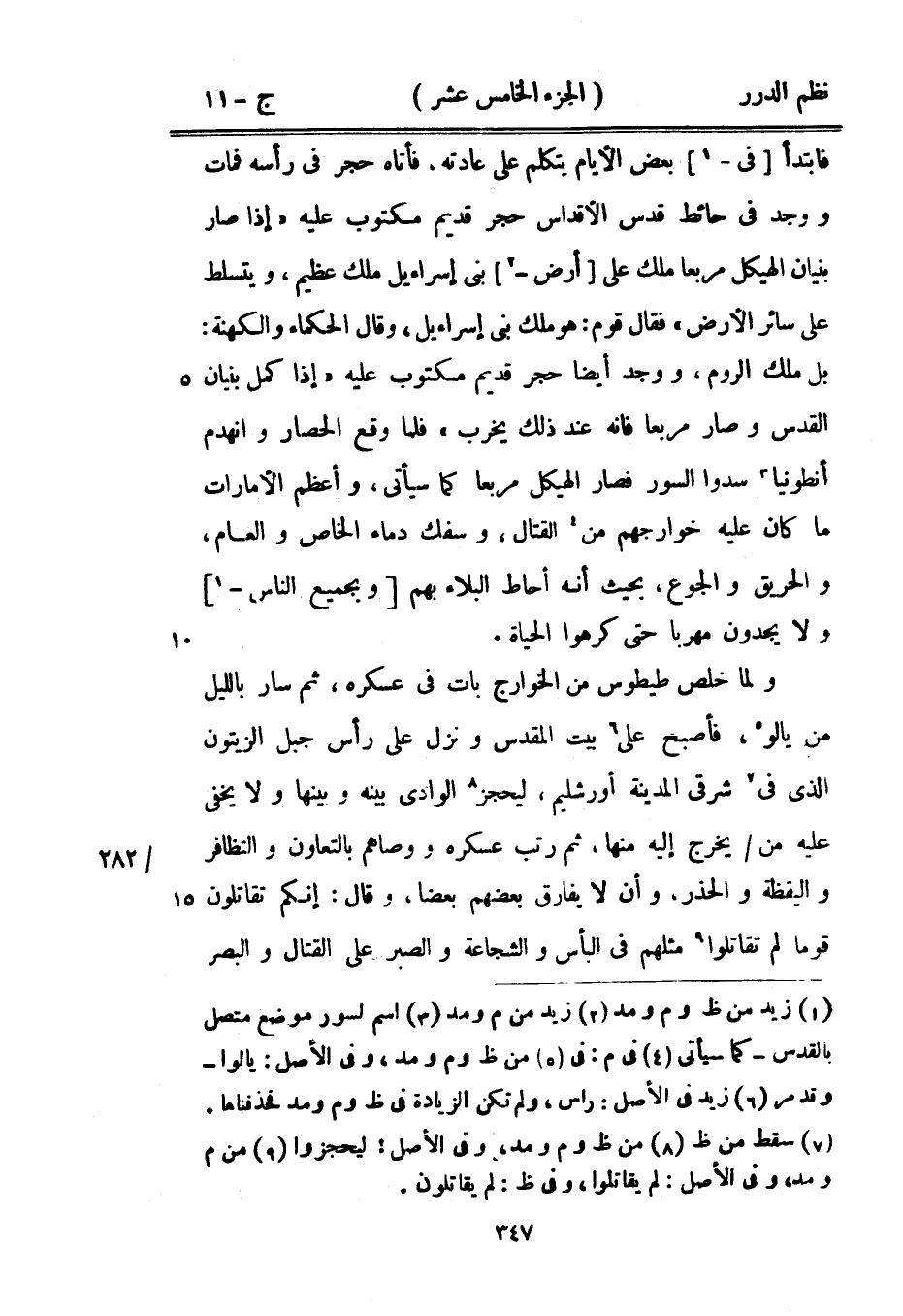 فابتدأ في بعض الأيام يتكلم على عادته، فأتاه حجر في رأسه فمات ووجد في حائط قدس الأقداس حجر قديم مكتوب عليه «إذا صار بنيان الهيكل مربعاً ملك على أرض بني إسرائيل ملك عظيم، ويتسلط على سائر الأرض» فقال قوم: هو ملك بني إسرائيل، وقال الحكماء والكهنة: بل الروم، ووجد أيضاً حجر قديم مكتوب عليه «إذا كمل بنيان القدس وصار مربعاً فإنه عند ذلك يخرب» فلما وقع الحصار وانهدم أنطونيا سدوا السور فصار الهيكل مربعاً كما سيأتي، وأعظم الأمارات ما كان عليه خوارجهم من القتال، وسفك دماء الخاص والعام، والحريق والجوع، بحيث إنه أحاط البلاء بهم وبجميع الناس ولا يجدون مهرباً حتى كرهوا الحياة.
