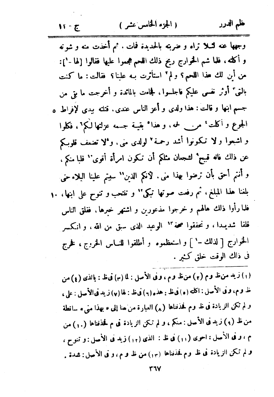 وحولت وجهها عنه لئلا تراه وضربته بالحديدة فمات، ثم أخذت منه وشوته وأكلته، فلما شم الخوارج ريح ذلك اللحم هجموا عليها فقالوا لها: من أين لك هذا اللحم؟ ولم استأثرت به علينا؟ فقال: ما كنت بالتي أوثر نفسي عليكم فاجلسوا، فجاءت بالمائدة وأخرجت ما بقي من جسم ابنها وقالت: هذا ولدي وأعز الناس عندي قتلته بيدي لإفراط الجوع وأكلت من لحمه، وهذا بقية جسمه عزلتها لكم، فكلوا واشعبوا ولا تكونوا أشد رحمة لولدي مني، ولا تضعف قلوبكم عن ذلك فإنه قبيح لشجعان مثلكم أن تكون امرأة أقوى قلباً منكم، وأنتم أحق بأن ترضوا بهذا مني، لأنكم الذين سببتم علينا البلاء حتى بلغنا هذا المبلغ، ثم رفعت صوتها تبكي وتنتحب وتنوح على ابنها، فلما رأوا ذلك هالهم وخرجوا مذعورين واشتهر خبرها، فقلق الناس قلقاً شديداً، وتحققوا صحة الوعيد الذي سبق من الله، وانكسر الخوارج لذلك واستعظموه وأطلقوا للناس الخروج، فخرج في ذلك الوقت خلق كثير.
