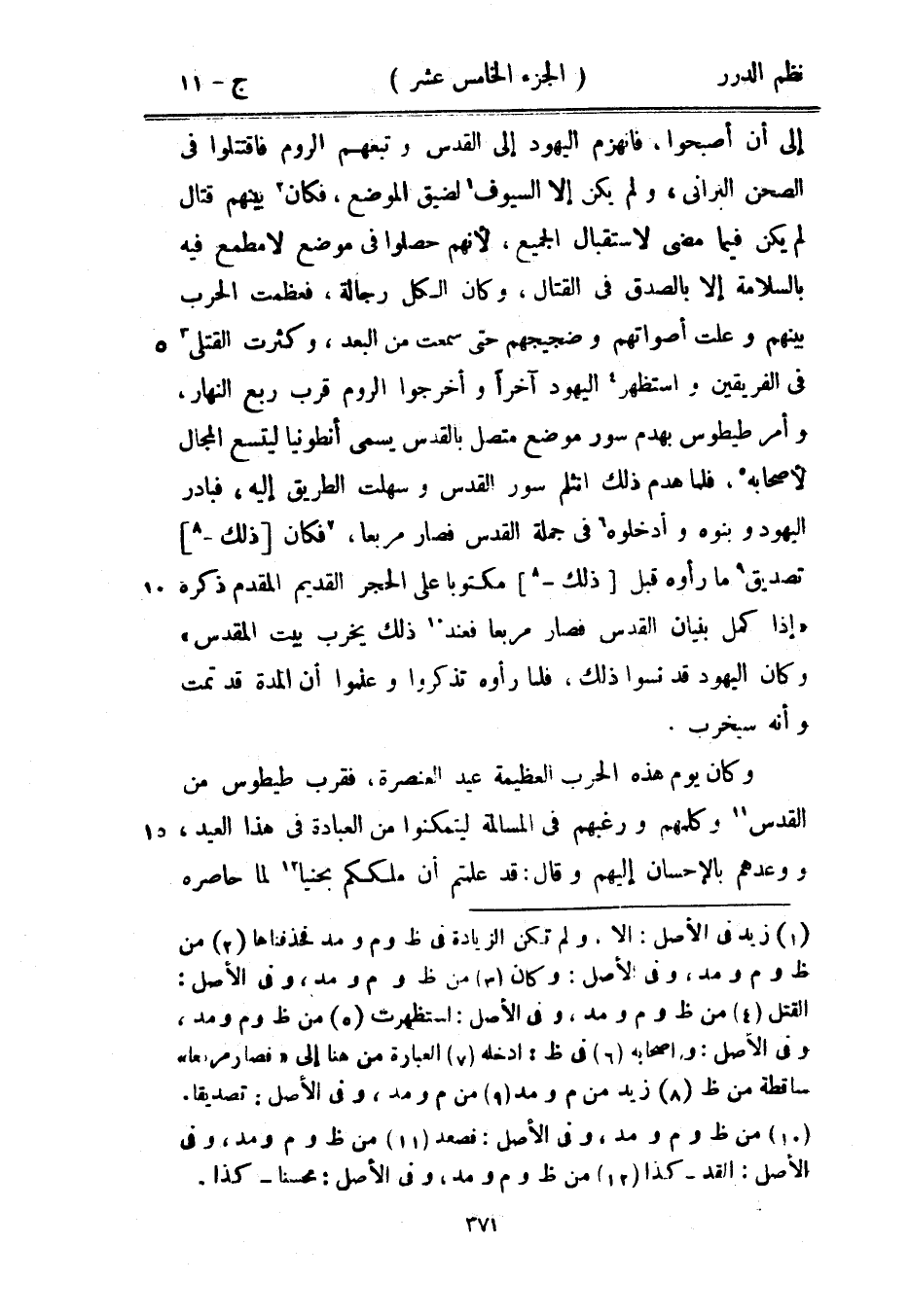 إلى أن أصبحوا، فانهزم اليهود إلى القدس وتبعهم الروم فاقتتلوا في الصحن البراني، ولم يكن إلا السيوف لضيق الموضع، فكان بينهما قتال لم يكن فيما مضى لاستقبال الجميع، لأنهم حصلوا في موضع لا مطمع فيه بالسلامة إلا بالصدق في القتال، وكان الكل رجالة، فعظمت الحرب بينهم وعلت أصواتهم وضجيجهم حتى سمعت من البعد، وكثرت القتلى في الفريقين واستظهر اليهود آخراً وأخرجوا الروم قرب ربع النهار، وأمر طيطوس بهدم سور مضوع متصل بالقدس يسمى أنطونيا ليتسع المجال لأصحابه، فلما هدم ذلك انثلم سور القدس وسهلت الطريق إليه، فبادر اليهود وبنوه وأدخلوه في جملة القدس فصار مربعاً، فكان ذلك تصديق ما رأوه قبل ذلك مكتوباً على الحجر القديم المقدم ذكره «إذا كمل بنيان القدس فصار مربعاً فعند ذلك يخرب بيت المقدس» وكان اليهود قد نسوا ذلك، فلما رأوه تذكروا وعلموا أن المدة قد تمت وأنه سيخرب.