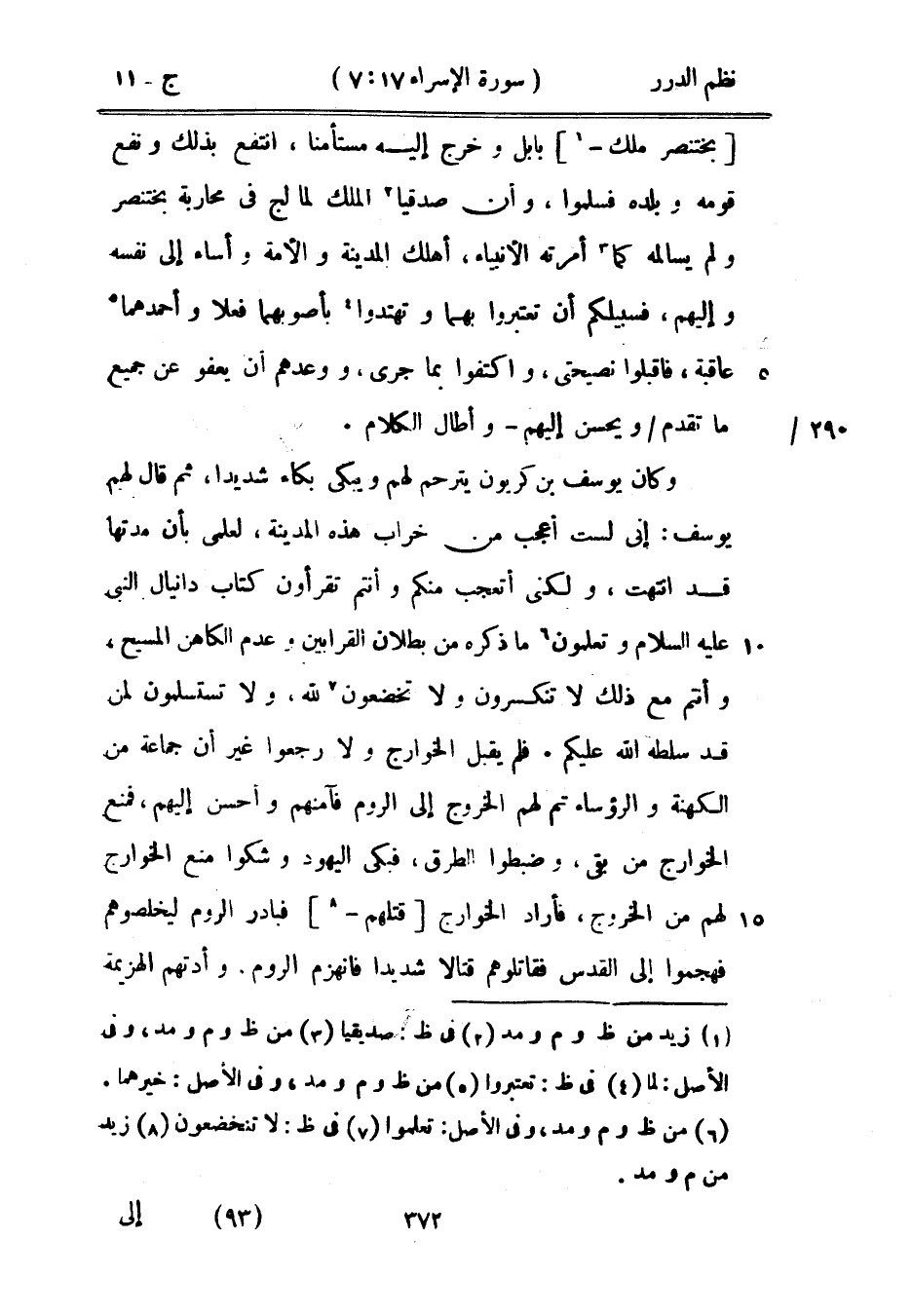 وكان يوسف بن كريون يترحم لهم ويبكي بكاء شديداً، ثم قال لهم يوسف: إني لست أعجب من خراب هذه المدينة، لعلمي بأن مدتها قد انتهت، ولكني أتعجب منكم وأنتم تقرؤون كتاب دانيال النبي عليه السلام وتعلمون ما ذكره من بطلان القرابين وعدم الكاهن المسيح، وأنتم مع ذلك لا تنكسرون ولا تخضعون لله، ولا تستسلمون لمن قد سلطه الله عليكم. فلم يقبل الخوارج ولا رجعوا غير أن جماعة من الكهنة والرؤساء تم لهم الخروج إلى الروم فآمنهم وأحسن إليهم، فمنع الخوارج من بقي، وضبطوا الطرق، فبكى اليهود وشكوا منع الخوارج لهم من الخروج، فأراد الخوارج قتلهم فبادر الروم ليخلصوهم فهجموا إلى القدس فقاتلوهم قتالاً شديداً فانهزم الروم، وأدتهم الهزيمة