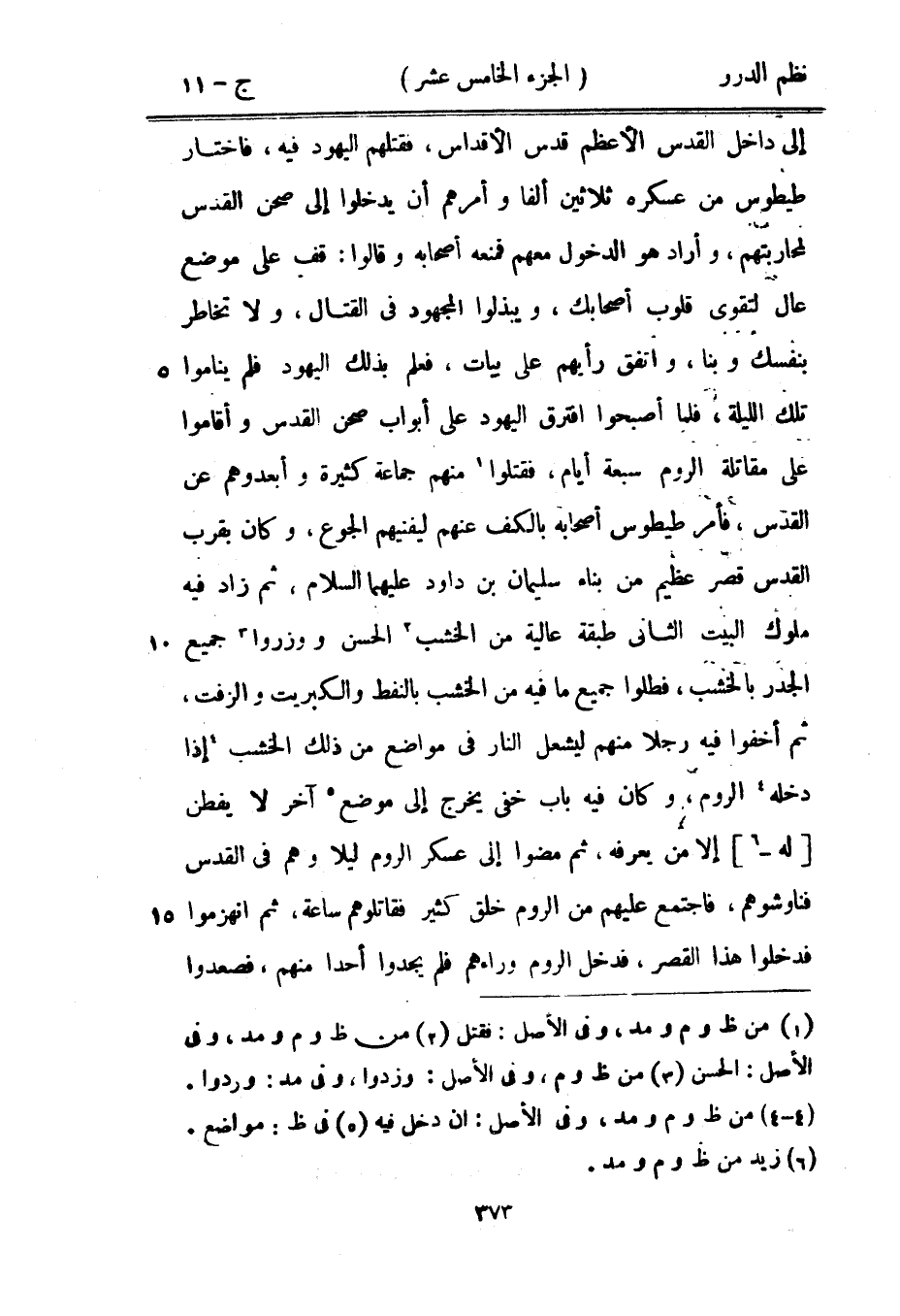 إلى داخل القدس الأعظم قدس الأقداس، فقتلهم اليهود فيه، فاختار طيطوس من عسكره ثلاثين ألفاً وأمرهم أن يدخلوا إلى صحن القدس لمحاربتهم، وأراد هو الدخول معهم فمنعه أصحابه وقالوا: قف على موضع عال لتقوى قلوب أصحابك، ويبذلوا المجهود في القتال، ولا تخاطر بنفسك وبنا، واتفق رأيهم على بيات، فعلم بذلك اليهود فلم يناموا تلك الليلة، فلما أصبحوا افترق اليهود على أبواب صحن القدس وأقاموا على مقاتلة الروم سبعة أيام، فقتلوا منهم جماعة كثيرة وأبعدوهم عن القدس، فأمر طيطوس أصحابه بالكف عنهم ليفنيهم الجوع، وكان بقرب القدس قصر عظيم من بناء سليمان بن داود عليهما السلام، ثم زاد فيه ملوك البيت الثاني طبقة عالية من الخشب الحسن ووزروا جميع الجدر بالخشب، فطلوا جميع ما فيه من الخشب بالنفط والكبريت والزفت، ثم أخفوا فيه رجلاً منهم ليشعل النار في مواضع من ذلك الخشب إذا دخله الروم، وكان فيه باب خفي يخرج إلى موضع آخر لا يفطن له إلا من يعرفه، ثم مضوا إلى عسكر الروم ليلاً وهم في القدس فناوشوهم، فاجتمع عليهم من الروم خلق كثير فقاتلوهم ساعة، ثم انهزموا فدخلوا هذا القصر، فدخل الروم وراءهم فلم يجدوا أحداً منهم، فصعدوا