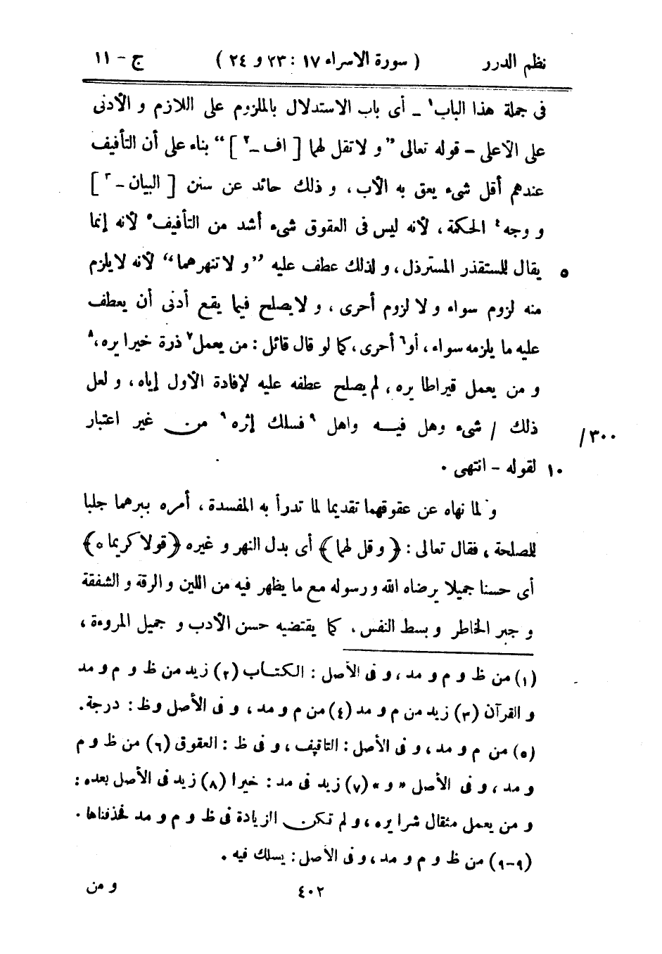 في جملة هذا الباب - أي باب الاستدلال بالملزوم على اللازم والأدنى على الأعلى - قوله تعالى: {ولا تقل لهما أف} بناء على أن التأفيف عندهم أقل شيء يعق به الأب، وذلك حائد عن سنن البيان ووجه الحكمة، لأنه ليس في العقوق شيء أشد من التأفيف لأنه إنما يقال للمستقذر المسترذل، ولذلك عطف عليه {ولا تنهرهما} لأنه لا يلزم منه لزوم سواء ولا لزوم أحرى، ولا يصلح فيما يقع أدنى أن يعطف عليه ما يلزمه سواء أو أحرى، كما لو قال قائل: من يعمل ذرة خيراً يره، ومن يعمل قيراطاً يره، لم يصلح عطفه عليه لإفادة الأول إياه، ولعل ذلك شيء وهل فيه واهل فسلك إثره من غير اعتبار لقوله - انتهى.