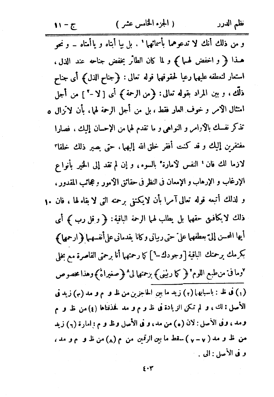 ومن ذلك أنك لا تدعوهما بأسمائهما، بل بيا أبتاه ويا أمتاه - ونحو هذا {واخفض لهما} ولما كان الطائر يخفض جناحه عند الذل، استعار لتعطفه عليهما رعياً لحقوقهما قوله تعالى: {جناح الذل} أي جناح ذلّك، وبين المراد بقوله تعالى: {من الرحمة} أي لا من أجل امتثال الأمر والنواهي وما تقدم لهما من من أجل الرحمة لهما، بأن لا تزال تذكر نفسك بالأوامر والنواهي وما تقدم لهما من الإحسان إليك، فصارا مفتقرين إليك وقد كنت أفقر خلق الله إليهما، حتى يصير ذلك خلقاً لازماً لك فإن النفس لأمارة بالسوء، وإن لم تقد إلى الخير بأنواع الإرغاب والإرهاب والإمعان في النظر في حقائق الأمور وعجائب المقدور، ولذلك أتبعه قوله تعالى آمراً بأن لا يكتفي برحمته التي لا بقاء لها، فإن ذلك لا يكافىء حقهما بل يطلب لهما الرحمة الباقية: {وقل رب} أي أيها المحسن إليّ بعطفهما عليّ حتى ربياني وكانا يقدماني على أنفسهما {ارحمهما} بكرمك برحمتك الباقية وجودك كما رحمتهما أنا برحمتي القاصرة مع بخلي وما فيّ من طبع اللوم {كما ربياني} برحمتهما لي {صغيراً *} وهذا مخصوص