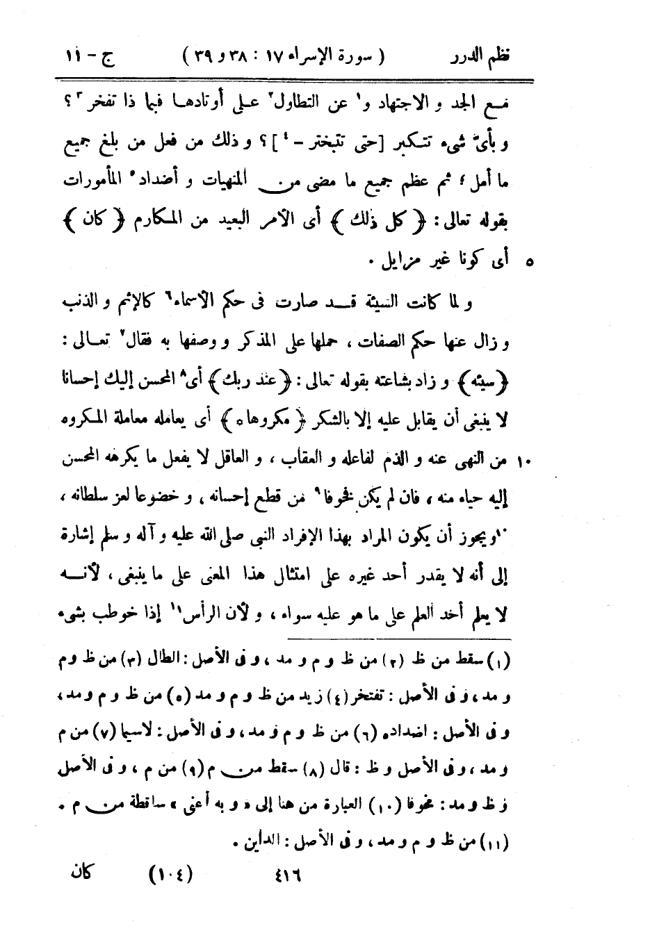 مع الجد والاجتهاد وعن التطاول على أوتادها فبماذا تفخر؟ وبأيّ شيء تتكبر حتى تتبختر؟ وذلك من فعل من بلغ جميع ما أمل؛ ثم عظم جميع ما مضى من المنهيات وأضداد المأمورات بقوله تعالى: {كل ذلك} أي الأمر البعيد من المكارم {كان} أي كوناً غير مزايل.