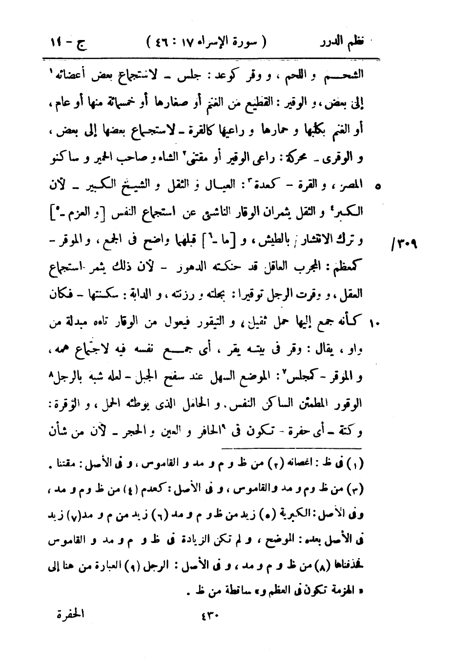 الشحم واللحم، ووقر كوعد: جلس - لاستجماع بعض أعضائه إلى بعض، والوقير: القطيع من الغنم أو صغارها أو خمسمائة منها أو عام، أو الغنم بكلبها وحمارها وراعيها كالقرة - لاستجماع بعضها إلى البعض، والوقري - محركة: راعي الوقير أو مقتني الشاء وصاحب الحمير وساكنو المصر، والقرة - كعدة: العيال والثقل والشيخ الكبير - لأن الكبر والثقل يثمران الوقار الناشىء عن استجماع النفس والعزم وترك الانتشار بالطيش، وما قبلهما واضح في الجمع، والموقر - كمعظم: المجرب العاقل قد حنكته الدهور - لأن ذلك يثمر استجماع العقل، ووقرت الرجل توقيراً: بجلته ورزنته، والدابة: سكنتها - فكان كأنه جمع إليها حمل ثقيل، والتيقور فيعول من الوقار تاءه مبدلة من واو، يقال: وقر في بيته يقر، أي جمع نفسه فيه لاجتماع همه، والموقر - كمجلس: الموضع السهل عند سفح الجبل - لعله شبه بالرجل الوقور المطمئن الساكن النفس، والحامل الذي يوطئه الحمل، والوقرة: وكتة - أي حفرة - تكون في الحافر والعين والحجر - لأن من شأن