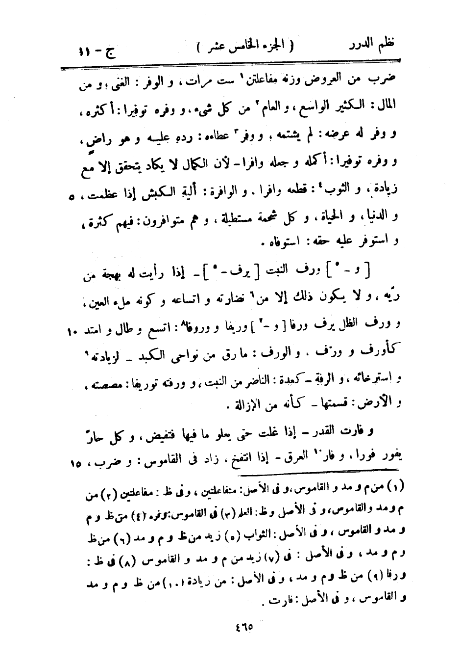 ضرب من العروض وزنه مفاعلتن ست مرات، والوفر: الغنى، ومن المال: الكثير الواسع، والعام من كل شيء، ووفره توفيراً: أكثره، ووفر له عرضه: لم يشتمه، ووفر عطاءه: رده عليه وهو راضٍ، ووفره توفيراً: أكمله وجعله وافراً - لأن الكمال لا يكاد يتحقق إلا مع زيادة، والثوب: قطعه وافراً، والوافرة: ألية الكبش إذا عظمت، والدنيا، والحياة، وكل شحمة مستطيلة، وهم متوافرون: فيهم كثرة، واستوفر عليه حقه: استوفاه.