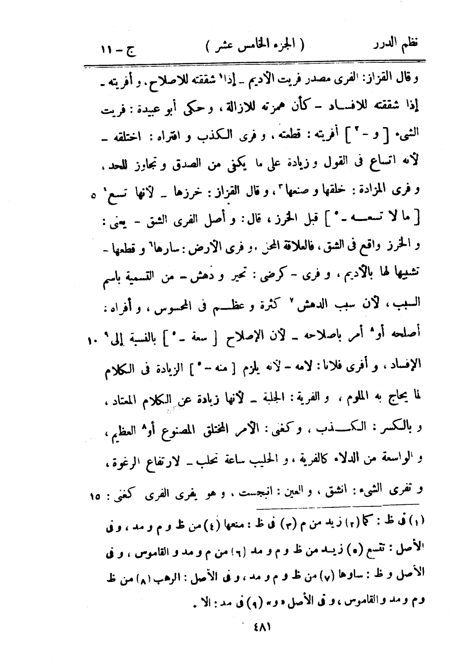 وقال القزاز: الفري مصدر فريت الأديم - إذا شققته للإصلاح، وأفريته - إذا شققته للإفساد - كأن همزته للإزالة، وحكى أبو عبيدة: فريت الشيء وأفريته: قطعته، وفرى الكذب وافتراه: اختلقه - لأنه اتساع في القول وزيادة على ما يكفي من الصدق وتجاوز للحد، وفرى المزادة: خلقها وصنعها، وقال القزاز: خرزها - لأنها تسع ما لا تسعه قبل الخرز، قال: وأصل الفري الشق - يعني: والخرز واقع في الشق، فالعلاقة المحل، وفرى الأرض: سارها وقطعها - تشبيهاً لها بالأديم، وفرى - كرضي: تحير ودهش - من التسمية باسم السبب، لأن سبب الدهش كثرة وعظم في المحسوس، وأفراه، أصلحه أو أمر بإصلاحه - لأن الإصلاح سعة بالنسبة إلى الإفساد، وأفرى فلاناً: لامه - لأنه يلزم منه الزيادة في الكلام لما يحاج به الملوم، والفرية: الجلبة - لأنها زيادة عن الكلام المعتاد، وبالكسر: الكذب، وكغنى: الأمر المختلق المصنوع أو العظيم، والواسعة من الدلاء كالفرية، والحليب ساعة تحلب - لارتفاع الرغوة، وتفرى الشيء: انشق، والعين: انبجست، وهو يفري الفرى كغنى: