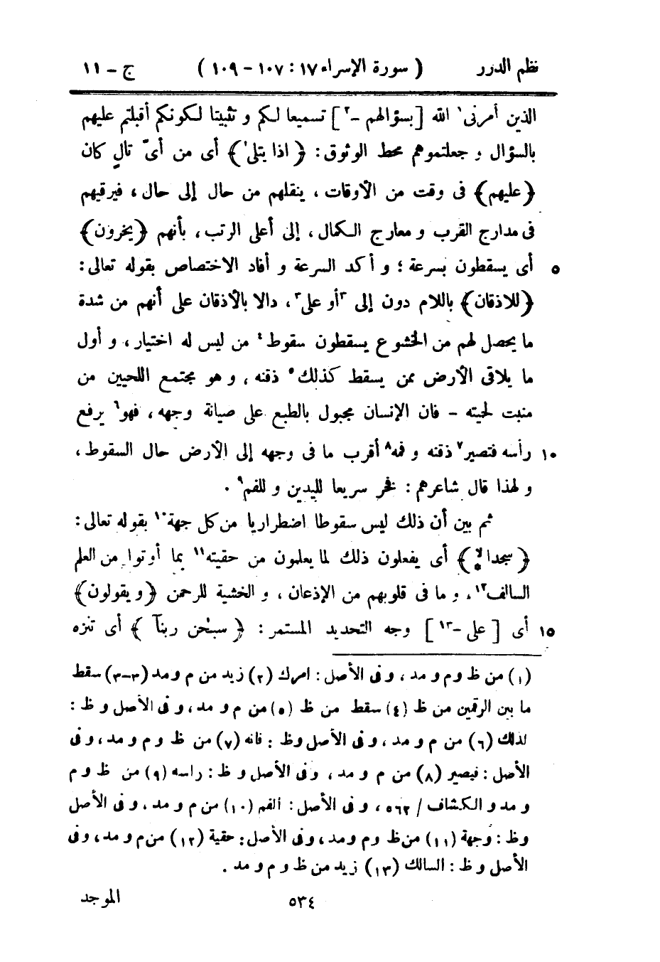 الذين أمرني الله بسؤالهم تسميعاً لكم وتثبيتاً لكونكم أقبلتم عليهم بالسؤال وجعلتموهم محط الوثوق: {إذا يتلى} أي من أيّ تالٍ كان {عليهم} في وقت من الأوقات، ينقلهم من حال إلى حال، فيرقيهم في مدارج القرب ومعارج الكمال، إلى أعلى الرتب، بأنهم {يخرون} أي يسقطون بسرعة؛ وأكد السرعة وأفاد الاختصاص بقوله تعالى: {للأذقان} باللام دون إلى أو على، دالاً بالأذقان على أنهم من شدة ما يحصل لهم من الخشوع يسقطون سقوط من ليس له اختيار، وأول ما يلاقي الأرض ممن يسقط كذلك ذقنه، وهو مجتمع اللحيين من منبت لحيته - فإن الإنسان مجبول بالطبع على صيانة وجهه، فهو يرفع رأسه فتصير ذقنه وفمه أقرب ما في وجهه إلى الأرض حال السقوط، ولهذا قال شاعرهم: فخر سريعاً لليدين وللفم.