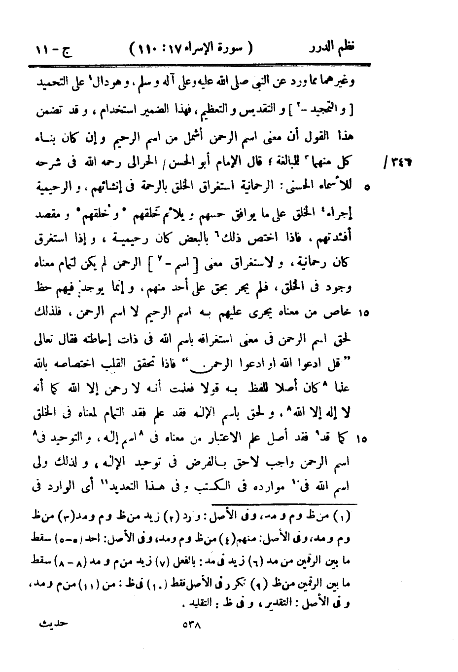 وغيرهما مما ورد عن النبي صلى الله عليه وعلى آله وسلم وهو دال على التحميد والتمجيد والتقديس والتعظيم، فهذا الضمير استخدام، وقد تضمن هذا القول أن معنى اسم الرحمن أشمل من اسم الرحيم وإن كان بناء كل منهما للمبالغة؛ قال الإمام أبو الحسن الحرالي رحمه الله في شرحه للأسماء الحسنى: الرحمانية استغراق الخلق بالرحمة في إنشائهم، والرحيمية إجراء الخلق على ما يوافق حسهم ويلائم خَلقهم وخُلقهم ومقصد أفئدتهم، فإذا اختص ذلك بالبعض كان رحيمية، وإذا استغرق كان رحمانية ولاستغراق معنى اسم الرحمن لم يكن لتمام معناه وجود الخلق، فلم يجر بحق على أحد منهم، وإنما يوجد فيهم حظ خاص من معناه يجري عليهم به اسم الرحيم لا اسم الرحمن، فلذلك لحق اسم الرحمن في معنى استغراقه باسم الله في ذات إحاطته فقال تعالى {قل ادعوا الله أو ادعوا الرحمن} فإذا تحقق القلب اختصاصه بالله علماً كان أصلاً للفظ به قولاً فعلمت أنه لا رحمن إلا الله كما أنه لا إله إلا الله، ولحق باسم الإله فقد علم فقد التمام لمعناه في الخلق كما قد فقد أصل علم الاعتبار من معناه في اسم إله، والتوحيد في اسم الرحمن واجب لاحق بالفرض في توحيد الإله، ولذلك ولي اسم الله في موارده في الكتب وفي هذا التعديد أي الوارد في