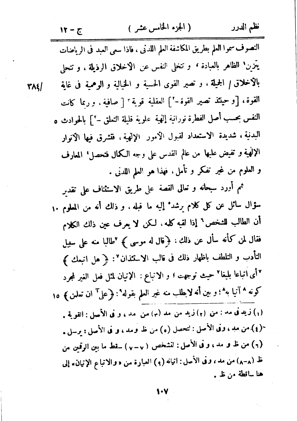 فأهل التصوف سموا العلم بطريق المكاشفة العلم اللدني، فإذا سعى العبد في الرياضيات يتزين الظاهر بالعبادة، وتتخلى النفس عن الأخلاق الرذيلة، وتتحلى بالأخلاق الجميلة، وتصير القوى الحسية والخيالية والوهمية في غاية القوة، وحينئذ تصير القوة العقلية قوية صافية، وربما كانت النفس بحسب أصل الفطرة نورانية إلهية علوية قليلة التعلق بالحوادث البدنية، شديدة الاستعداد لقبول الأمور الإلهية، فتشرق فيها الأنوار الإلهية وتفيض عليها من عالم القدس على وجه الكمال فتحصل المعارف والعلوم من غير تفكر وتأمل، فهذا هو العلم اللداني.
