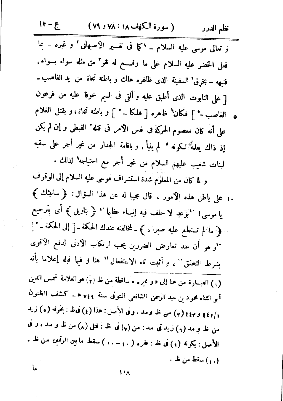 وتعالى موسى عليه السلام - كما في تفسير الأصبهاني وغيره - بما فعل الخضر عليه السلام على ما وقع له هو من مثله سواء بسواء، فنبهه - بخرق السفينة الذي ظاهره هلك وباطنه نجاة من يد الغاصب - على التابوت الذي أطبق عليه وألقي في اليم خوفاً عليه من فرعون الغاصب فكان ظاهره هلكاً وباطنه نجاة، وبقتل الغلام على أنه كان معصوم الحركة في نفس الأمر في قتله القبطي وإن لم يكن إذ ذاك يعلمه لكونه لم ينبأ، وبأقامة الجدار من غير أجر على سقيه لبنات شعيب عليهم السلام من غير أجر مع احتياجه لذلك.