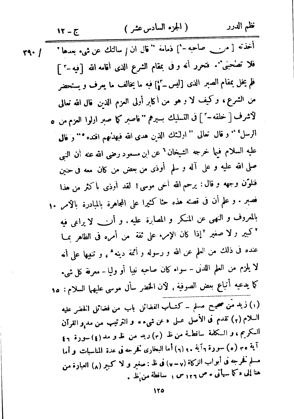 {قال إن سألتك عن شيء بعدها فلا تصاحبني} . فتحرر أنه وفى بمقام الشرع الذي أقامه الله فيه فلم يخل بمقام الصبر الذي ليس فيه ما يخالف ما يعرف ويستحضر من الشرع، وكيف لا وهو من أكابر أولي العزم الذين قال الله تعالى لأشرف خلقه في التسليك بسيرهم {فاصبر كما صبر أولو العزم من الرسل} [الأحقاف: 35] وقال تعالى: {أولئك الذين هدى الله فبهداهم اقتده} [الأنعام: 90] وقال عليه السلام فيما خرجه الشيخان عن ابن مسعود رضي الله عنه أن النبي صلى الله عليه وعلى آله وسلم أوذي من بعض من كان معه في حنين فتلوّن وجهه وقال: «يرحم الله أخي موسى! لقد أوذي بأكثر من هذا فصبر» وعلم أن في قصته هذه حثاً كثيراً على المجاهرة بالمبادرة بالأمر بالمعروف والنهي عن المنكر والمصابرة عليه، وأن لا يراعى فيه كبير ولا صغير إذا كان الإمرء على ثقة من أمره في الظاهر بما عنده في ذلك من العلم عن الله ورسوله وأئمة دينه، وتنبيهاً على أنه لا يلزم من العلم اللدني - سواء كان صاحبه نبياً أو ولياً - معرفة كل شيء كما يدعيه أتباع بعض الصوفية، لأن الخضر سأل موسى عليهما السلام:
