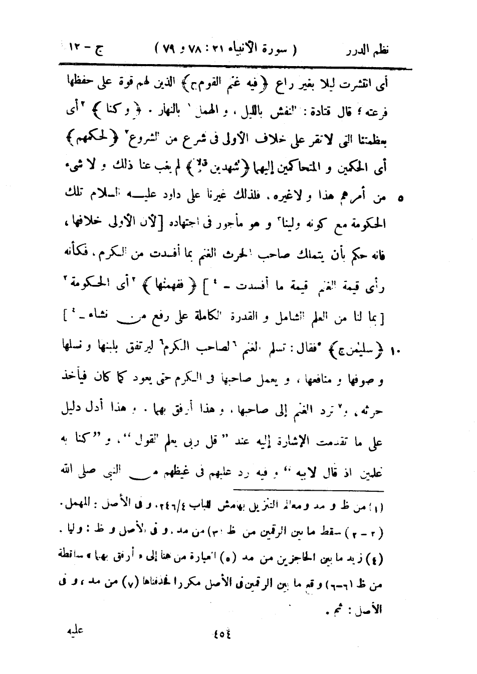 {وكنا} أي بعظمتنا التي لا تقر على خلاف الأولى في شرع من الشروع {لحكمهم} أي الحكمين والمتحاكمين إليهما {شاهدين} لم يغب عنا ذلك ولا شيء من أمرهم هذا ولا غيره، فذلك غيرنا على داود عليه السلام تلك الحكومة مع كونه ولينا وهو مأجور في اجتهاده لأن الأولى خلافها، فإنه حكم بأن يمتلك صاحب الحرث الغنم بما أفسدت من الكرم، فكأنه رأى قيمة الغنم قيمة ما أفسدت {ففهمناها} أي الحكومة بما لنا من العلم الشامل والقدرة الكاملة على رفع من نشاء {سليمان} فقال: تسلم الغنم لصاحب الكرم ليرتفق بلبنها ونسلها وصوفها ومنافعها، ويعمل صاحبها في الكرم حتى يعود كما كان فيأخذ حرثه، وترد الغنم إلى صاحبها، وهذا أرفق بهما. وهذا أدل دليل على ما تقدمت الإشارة إليه عند {قل ربي يعلم القول} ، و {كنا به عالمين إذ قال لأبيه} وفيه رد عليهم في غيظهم من النبي صَلَّى اللهُ عَلَيْهِ وَسَلَّمَ