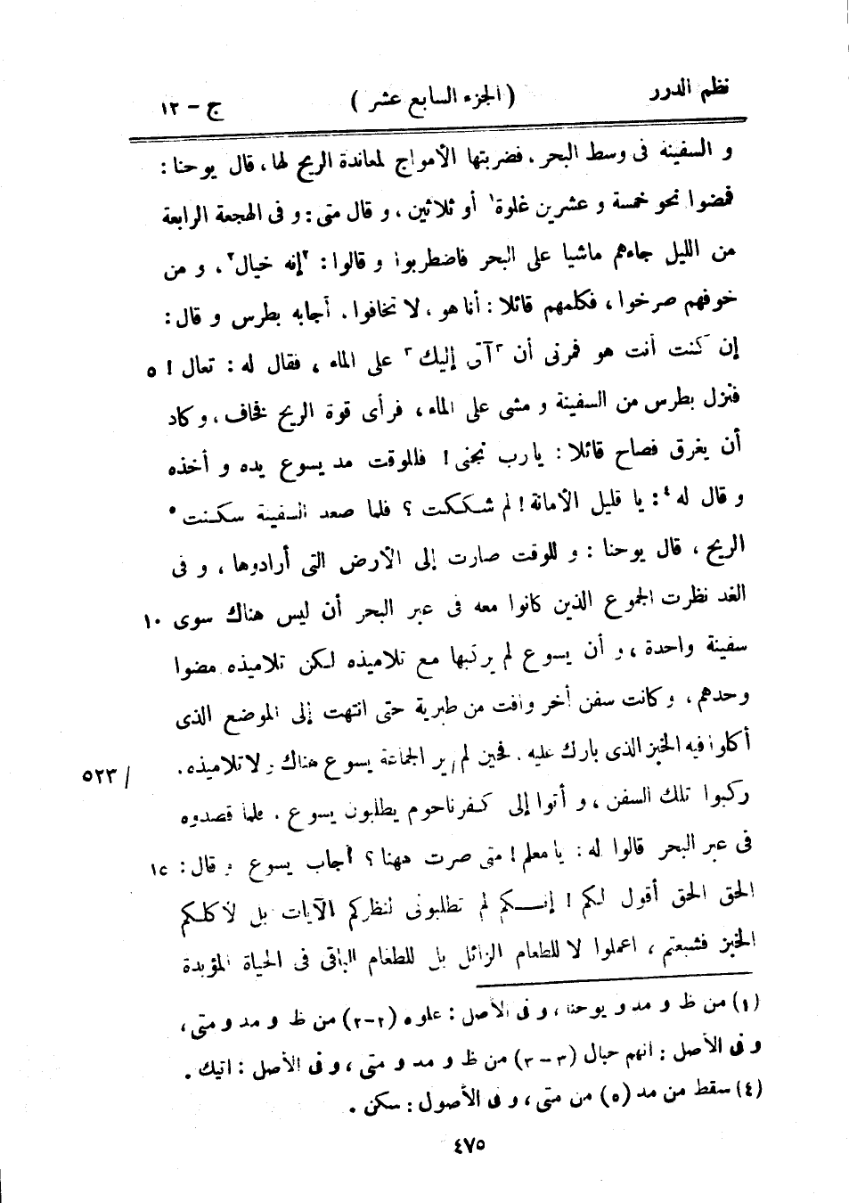 والسفينة في وسط البحر، فضربتها الأمواج لمعاندة الريح لها، قال يوحنا: فمضوا نحو خمسة وعشرين غلوة أو ثلاثين، وقال متى: وفي الهجعة الرابعة من الليل جاءهم ماشياً على البحر فاضطربوا وقالوا: إنه خيال، ومن خوفهم صرخوا، فكلمهم قائلاً: أنا هو، لا تخافوا، أجابه بطرس وقالوا: إن كنت أنت هو فمرني أن آتي إليك على الماء، فقال له: تعال! فنزل بطرس من السفينة ومشى على الماء، فرأى قوة الريح فخاف، وكاد أن يغرق فصاح قائلاً: يا رب نجني! فللوقت مد يسوع يده وأخذه وقال له: يا قليل الأمانة! لم شككت؟ فلما صعد السفينة سكنت الريح، قال يوحنا: وللوقت صارت إلى الأرض التي أرادوها، وفي الغد نظرت الجموع الذين كانوا معه في عبر البحر أن ليس هناك سوى سفينة واحدة، وأن يسوع لم يركبها مع تلاميذه لكن تلاميذه مضوا وحدهم، وكانت سفن أخر وافت من طبرية حتى انتهت إلى الموضع الذي أكلوا الخبز الذي بارك عليه، فحين لم ير الجماعة يسوع هناك ولا تلاميذه، ركبوا تلك السفن، وأتوا إلى كفر ناحوم يطلبون يسوع، فلما قصدوه في عبر البحر قالوا له: يا معلم! متى صرت هاهنا؟ أجاب يسوع وقال: الحق الحق أقول لكم! إنكم لم تطلبوني لنظركم الآيات بل لأكلكم الخبز فشبعتم، اعلموا لا للطعام الزائل بل للطعام الباقي في الحياة المؤبدة