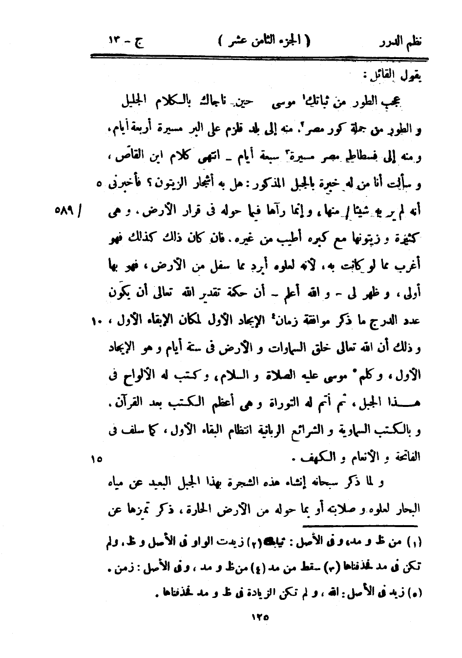 والطور من جملة كور مصر، منه إلى بلد قلزم على البر مسيرة أربعة أيام، ومنه إلى فسطاط مصر مسيرة سبعة أيام - انتهى كلام ابن القاص، وسألت أنا من له خبرة بالجبل المذكور: هل به أشجار الزيتون؟ فأخبرني أنه لم ير به شيئاً منها، وإنما رآها فيما حوله في قرار الأرض، وهي كثيرة وزيتونها مع كبره أطيب من غيره، فإن كان ذلك كذلك فهو أغرب مما لو كانت به، لأنه لعلوه أبرد مما سفل من الأرض، فهو بها أولى، وظهر لي - والله أعلم - أن حكمة تقدير الله تعالى أن يكون عدد الدرج ما ذكر موافقة زمان الإيجاد الأول لمكان الإبقاء الأول، وذلك أن الله تعالى خلق السماوات والأرض في ستة أيام وهو الإيجاد الأول، وكلم موسى عليه الصلاة والسلام، وكتب له الألواح في هذا الجبل، ثم أتم له التوراة وهي أعظم الكتب بعد القرآن، وبالكتب السماوية والشرائع الربانية انتظام البقاء الأول، كما سلف في الفاتحة والأنعام والكهف.