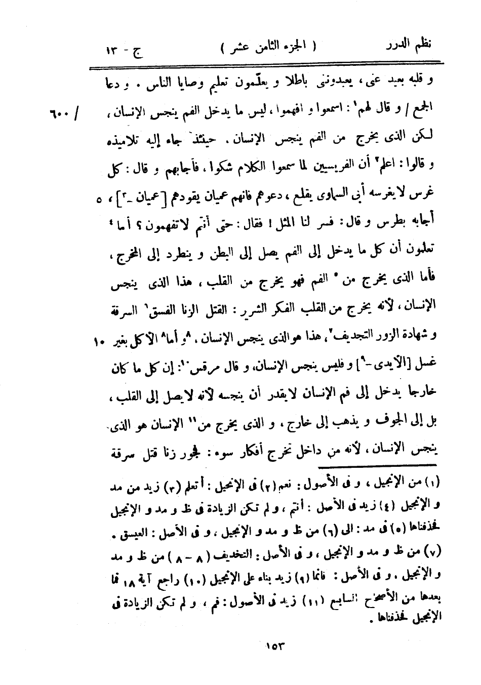 وقلبه بعيد عني، يعبدونني باطلاً ويعلّمون تعليم وصايا الناس. ودعا الجمع وقال لهم: اسمعوا وافهموا، ليس ما يدخل الفم ينجس الإنسان، لكن الذي يخرج من الفم ينجس الإنسان، حينئذ جاء إليه تلاميذه وقالوا: اعلم أن الفريسيين لما سمعوا الكلام شكوا، فأجابهم وقال: كل غرس لا يغرسه أبي السماوي يقلع، دعوهم فإنهم عميان يقودهم عميان، أجابه بطرس وقال: فسر لنا المثل! فقال: حتى أنتم لا تفهمون؟ أما تعلمون أن كل ما يدخل إلى الفم يصل إلى البطن وينطرد إلى المخرج، فأما الذي يخرج من الفم فهو يخرج من القلب، هذا الذي ينجس الإنسان، لأنه يخرج من القلب الفكر الشرير: القتل الزنى الفسق السرقة وشهادة الزور التجديف، هذا هو الذي ينجس الأنسان، وأما الأكل بغير غسل الأيدي وفليس ينجس الإنسان، وقال مرقس: إن كل ما كان خارجاً يدخل إلى فم الإنسان لا يقدر أن ينجسه لأنه لا يصل إلى القلب، بل إلى الجوف ويذهب إلى خارج، والذي يخرج من الإنسان هو الذي ينجس الإنسان، لأنه من داخل تخرج أفكار السوء: فجور الزنى قتل سرقة