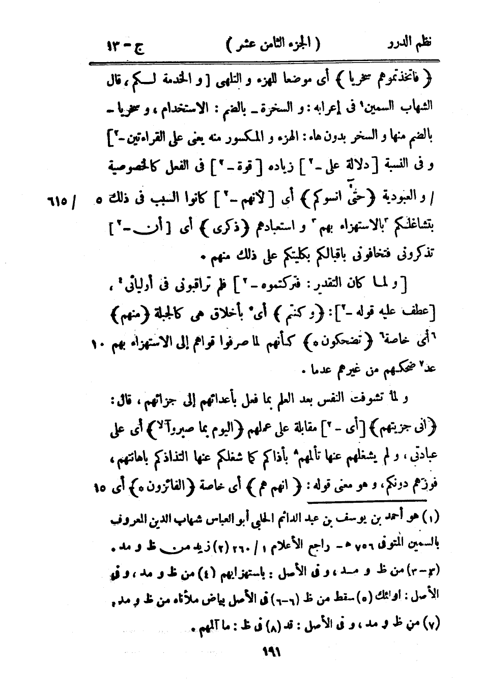 {فاتخذتموهم سخرياً} أي موضعاً للهزء والتلهي والخدمة لكم، قال الشهاب السمين في إعرابه: والسخرة - بالضم: الاستخدام، وسخريا - بالضم منها والسخر بدون هاء - الهزء والمكسور منه يعني على القراءتين وفي النسبة دلالة على زيادة قوة في الفعل كالخصوصية والعبودية {حتى أنسوكم} أي لأنهم كانوا السبب في ذلك بتشاغلكم بالاستهزاء بهم واستبعادهم {ذكري} أي أن تذكروني فتخافوني بإقبالكم بكليتكم على ذلك منهم.