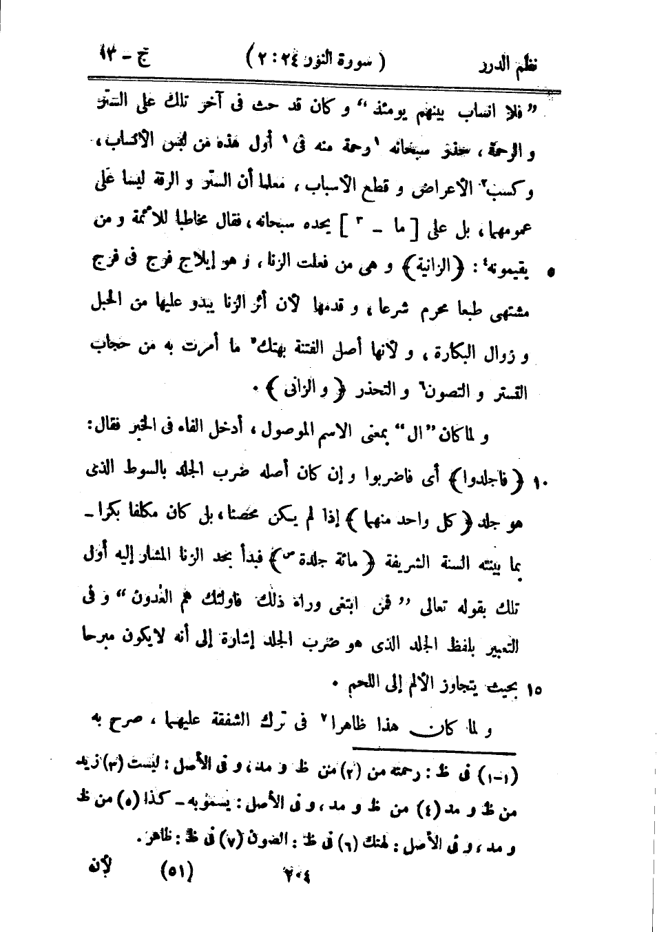 ولما كان «ال» بمعنى الاسم الموصول، أدخل الفاء في الخبر فقال: {فاجلدوا} أي فاضربوا وإن كان أصله ضرب الجلد بالسوط الذي هو جلد {كل واحد منهما} إذا لم يكن محصناً، بل كان مكلفاً بكراً - بما بينته السنة الشريفة {مائة جلدة} فبدأ بحد الزنى المشار إليه أول تلك بقوله تعالى {فمن ابتغى وراء ذلك فأولئك هم العادون} [المؤمنون: 7] وفي التعبير بلفظ الجلد الذي هو ضرب الجلد إشارة إلى أنه يكون مبرحاً بحيث يتجاوز الألم إلى اللحم.
