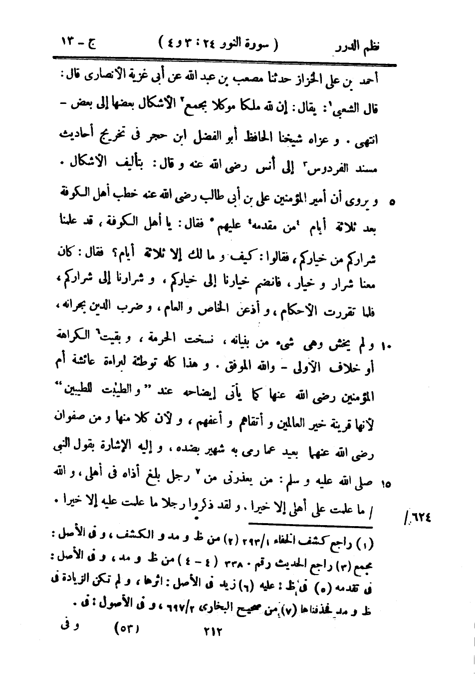 أحمد بن علي الخزاز حدثنا مصعب بن عبد الله عن أبي غزية الأنصاري قال: قال الشعبي: يقال: إن لله ملكاً موكلاً بجمع الأشكال بعضها إلى بعض - انتهى. وعزاه شيخنا الحافظ أبو الفضل بن حجر في تخريج أحاديث مسند الفردوس إلى أنس رضي الله عنه وقال: بتأليف الأشكال. ويروى أن أمير المؤمنين علي ابن أبي طالب رضي الله عنه خطب أهل الكوفة بعد ثلاثة أيام من مقدمه عليهم فقال: يا أهل الكوفة، قد علمنا شراركم من خياركم، فقالوا: كيف وما لك إلا ثلاثة أيام؟ فقال: كان معنا شرار وخيار، فانضم خيارنا إلى خياركم، وشرارنا إلى شراركم، فلما تقررت الأحكام، وأذعن الخاص والعام، وضرب الدين بجرانه، ولم يخش وهي شيء من بنيانه، نسخت الحرمة، وبقيت الكراهة أو خلاف الأولى - والله الموفق. وهذا كله توطئة لبراءة عائشة أم المؤمنين رضي الله عنها كما يأتي إيضاحه عنه {والطيبات للطيبين} لأنها قرينة خير العالمين وأتقاهم وأعفهم، ولأن كلاًّ منها ومن صفوان رضي الله عنهما بعيد عما رمى به شهير بضده، وإليه الإشارة