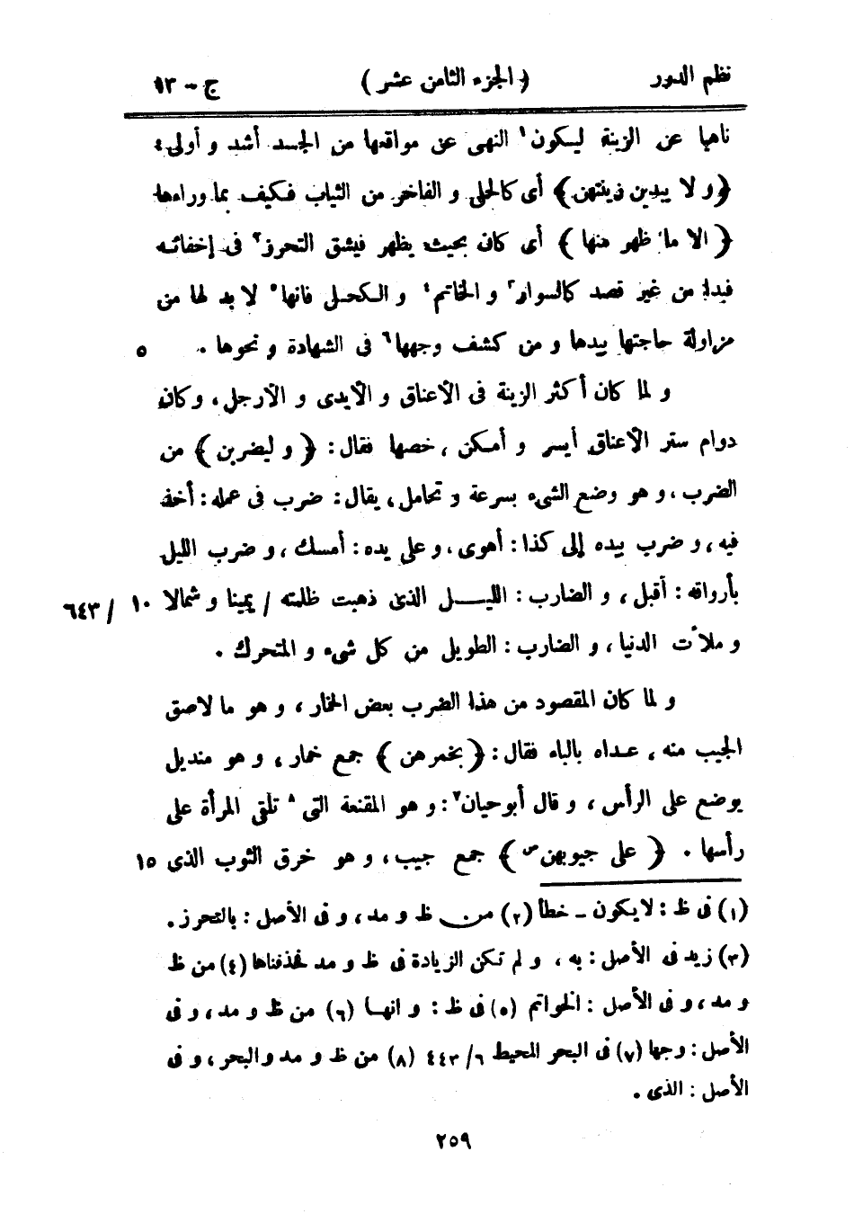 ولما كان أكثر الزينة في ألأعناق والأيدي والأرجل، وكان دوام ستر الأعناق أيسر وأمكن، خصها فقال: {وليضربن} من الضرب، وهو وضع الشيء بسرعة وتحامل، يقال: ضرب في عمله: أخذ فيه، وضرب بيده إلى كذا: أهوى، وعلى يده: أمسك، وضرب الليل بأوراقه: أقبل، والضارب: الليل الذي ذهبت ظلمته يميناً وشمالاً وملأت الدنيا، والضارب: الطويل من كل شيء والمتحرك.