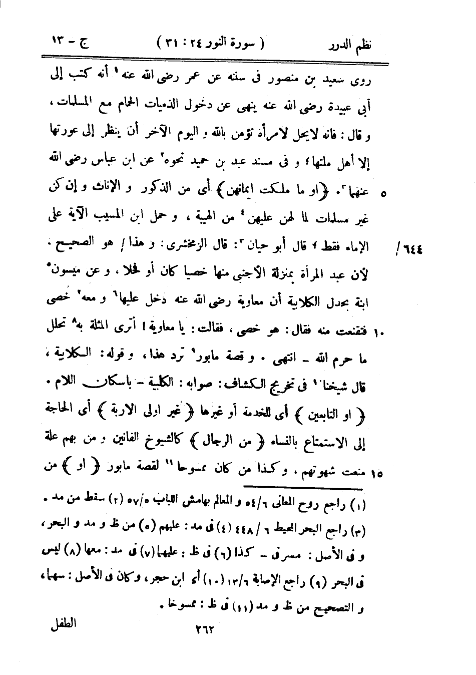 روى سعيد بن منصور في سننه عن عمر رضي الله عنه أنه كتب إلى عبيدة رضي الله عنه ينهى عن دخول الذميات الحمام مع المسلمات، وقال: فإنه لا يحل لامرأة تؤمن بالله واليوم الآخر أن ينظر إلى عورتها إلا أهل ملتها، وفي مسند عبد بن حميد نحوه عن ابن عباس رضي الله عنهما. {وأما ما ملكت أيمانهن} أي من الذكور والإناث وإن كن غير مسلمات لما لهن عليهن من الهيبة، وحمل ابن المسيب الآية على الإماء فقط؛ قال أبو حيان: قال الزمخشري: وهذا هو الصحيح، لأن عبد المرأة بمنزلة الأجنبي منها خصيّاً كان أو فحلاً، وعن ميسون بنة بحدل الكلابية أن معاوية رضي الله عنه دخل عليها ومعه خصي فتقنعت منه فقال: هو خصي، فقالت: يا معاوية! أترى المثلة به تحلل ما حرم الله - انتهى.