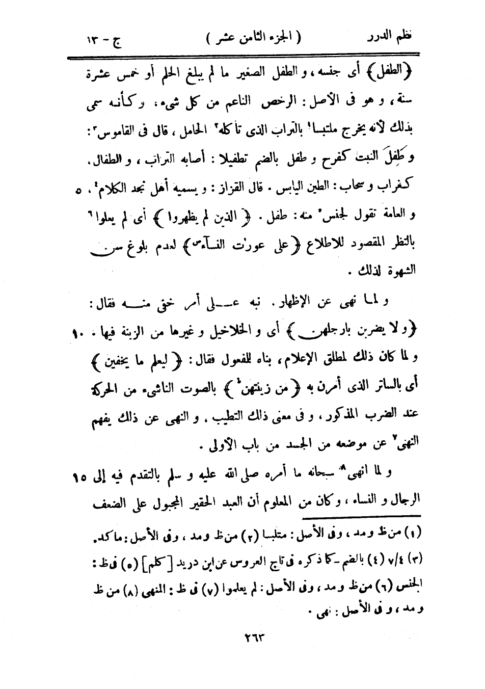 {الطفل} أي جنسه، والطفل الصغير ما لم يبلغ الحلم أو خمس عشرة سنة، وهو في الأصل: الرخص الناعم من كل شيء، وكأنه سمي بذلك لأنه يخرج ملتبساً بالتراب الذي تأكله الحامل، قال في القاموس: وطفل النبت كفرح وطفل بالضم تطفيلاً: أصابه التراب، والطفال، كغراب وسحاب: الطين اليابس. قال القزاز: ويسميه أهل نجد الكلام والعامة تقول لجنس منه: طفل، {الذين لم يظهروا} أي لم يعلوا بالنظر المقصود للاطلاع {على عورات النساء} لعم بلوغ سن الشهوة لذلك.