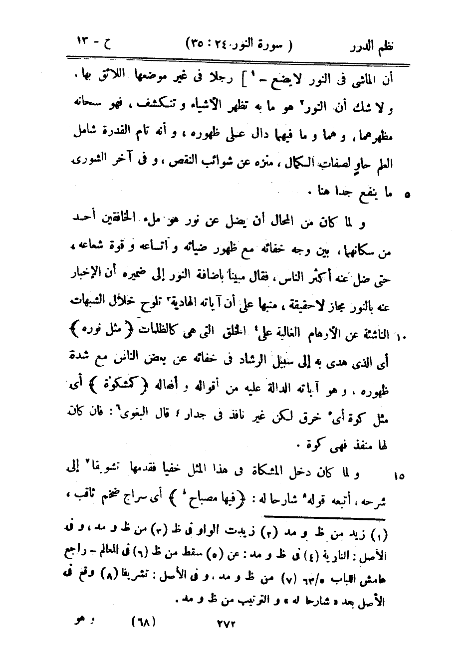 أن الماشي في النور لا يضع رجلاً في غير موضعها اللائق بها، ولا شك أن النور هو ما به تظهر به الأشياء وتنكشف، فهو سبحانه مظهرهما، وهما وما فيهما دال على ظهوره، وأنه تام القدرة شامل العلم حاوٍ لصفات الكمال، منزه عن شوائب النقص، وفي آخر الشورى ما ينفع جداً هنا.
