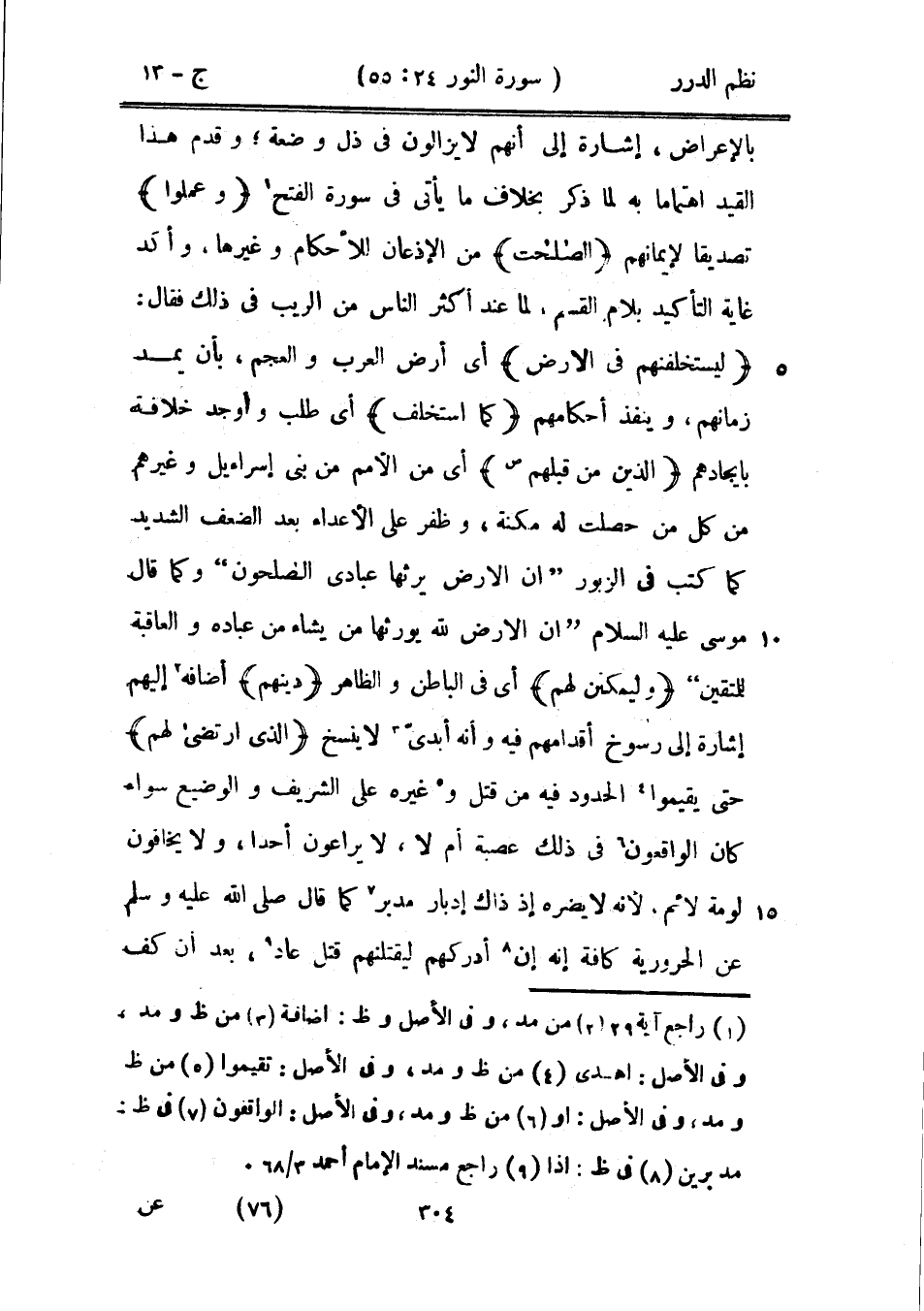 بالإعراض، إشارة إلى أنهم لا يزالون في ذل وضعة؛ وقدم هذا القيد اهتماماً به لما ذكر بخلاف ما يأتي في سورة الفتح {وعملوا} تصديقاً لإيمانهم {الصالحات} من الإذعان للأحكام وغيرها، وأكد غاية التأكيد بلام القسم، لما عند أكثر الناس من الريب في ذلك فقال: {ليستخلفنهم في الأرض} أي أرض العرب والعجم، بأن يمد زمانهم، وينفذ أحكامهم {كما استخلف} أي طلب وأوجد خلافة بإيجادهم {الذين من قبلهم} أي من الأمم من بني إسرائيل وغيرهم من كل من حصلت له مكنة، وظفر على الأعداء بعد الضعف الشديد كما كتب في الزبور {أن الأرض يرثها عبادي الصالحون} وكما قال موسى عليه السلام: {إن الأرض لله يورثها من يشاء من عباده والعاقبة للمتقين} {وليمكنن لهم} أي في الباطن والظاهر {دينهم} أضافة إليهم إشارة إلى رسوخ أقدامهم فيه وأنه أبديّ لا ينسخ {الذي ارتضى لهم} حتى يقيموا الحدود فيه من قتل وغيره على الشريف والوضيع سواء كان الواقعون في ذلك عصبة أم لا، لا يراعون أحداً، ولا يخافون لومة لأئم، لأنه لا يضره إذ ذاك إدباراً مدبر كما قال صَلَّى اللهُ عَلَيْهِ وَسَلَّمَ عن الحرورية كافة