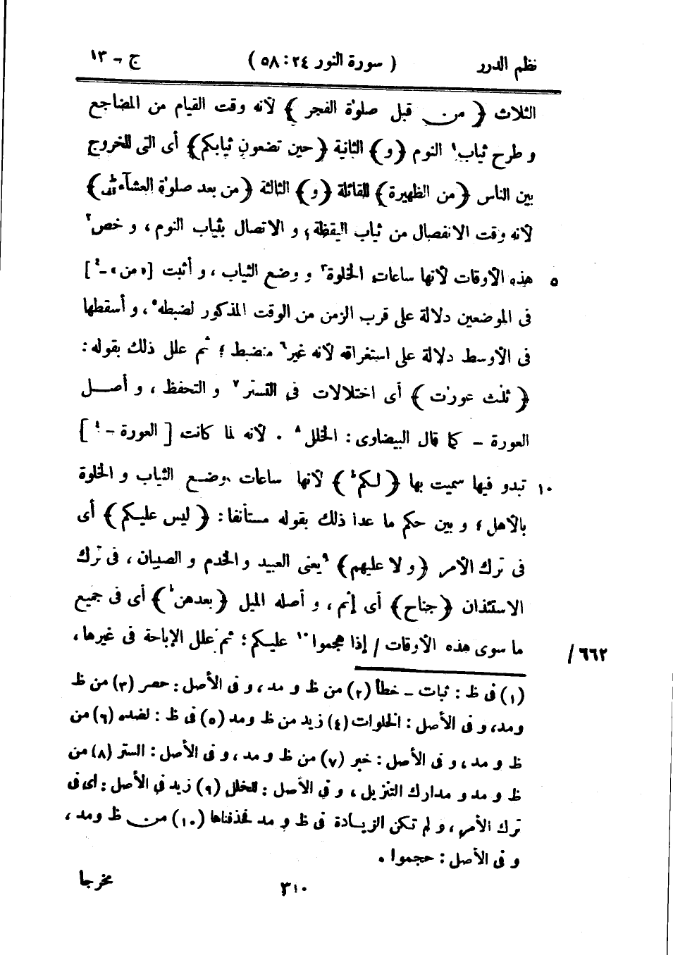 الثلاث {من قبل صلاة الفجر} لأنه وقت القيام من المضاجع وطرح ثياب النوم {و} الثانية {حين تضعون ثيابكم} أي التي للخروج بين الناس {من الظهيرة} للقائلة {و} الثالثة {من بعد صلاة العشاء} لأنه وقت الانفصال من ثياب اليقظة، والاتصال بثياب النوم، وخص هذه الأوقات لأنها ساعات الخلوة، ووضع الثياب، وأثبت من في الموضعين دلالة على قرب الزمن من الوقت المذكور لضبطه، وأسقطها في الأوسط دلالة على استغراقه لأنه غير منضبط، ثم علل ذلك بقوله: {ثلاث عورات} أي اختلالات في التستر والتحفظ، وأصل العورة - كما قال البيضاوي: الخلل.