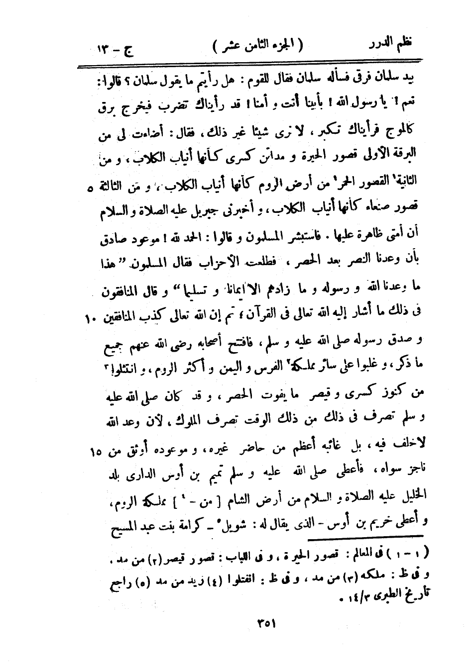 وقال المنافقون في ذلك ما أشار إليه الله تعالى في القرآن؛ ثم إن الله تعالى كذب المنافقين وصدق رسوله صَلَّى اللهُ عَلَيْهِ وَسَلَّمَ، فافتتح أصحابه رضي الله عنهم جميع ما ذكر، وغلبوا على سائر مملكة الفرس واليمن وأكثر الروم، وانتثلوا من كنوز كسرى وقيصر ما يفوت الحصر، وقد كان صَلَّى اللهُ عَلَيْهِ وَسَلَّمَ تصرف في ذلك من ذلك الوقت تصرف الملوك، لأن وعد الله لا خلف فيه، بل غائبه أعظم من حاضره غيره، وموعودة أوثق من ناجز سواه، فأعطى صَلَّى اللهُ عَلَيْهِ وَسَلَّمَ تميم بن أوس الداري بلد الخليل عليه الصلاة والسلام من أرض الشام من مملكة الروم، وأعطى خريم بن أوس - الذي يقال له: شويل - كرامة بنت عبد المسيح