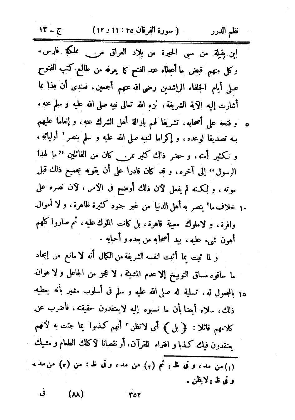 ابن بقيلة من سبي الحيرة من بلاد العراق من مملكة فارس، وكل منهم قبض ما أعطاه عند الفتح كما يعرفه من طالع كتب الفتوح علىأيام الخلفاء الراشدين رضي الله عنهم أجمعين، فعندي أن هذا مما أشارت إليه الاية الشريفة، نزه الله تعالى نبيه صَلَّى اللهُ عَلَيْهِ وَسَلَّمَ عنه وفتحه على أصحابه، تشريفاً لهم بإزالة أهل الشرك عنه، وإنعاماً عليهم به تصديقاً لوعده، وإكراماً لنبيه صَلَّى اللهُ عَلَيْهِ وَسَلَّمَ بنصر أوليائه وتكثير أمته، وحضر ذلك كثير ممن كان من القائلين {ما لهذا الرسول} [الفرقان: 7] إلى آخره، وقد كان قادراً على أن يقويه بجميع ذلك قبل موته، ولكنه لم يفعل لأن ذلك أوضح في الأمر، لأن نصره على خلاف ما ينصر به أهل الدنيا من غير جنود كثيرة ظاهرة، ولا أموال وافرة، ولا ملوك معينة قاهرة، بل كانت الملوك عليه، ثم صاروا كلهم أهون شيء عليه، بيد أصحابه من بعده وأحبابه.