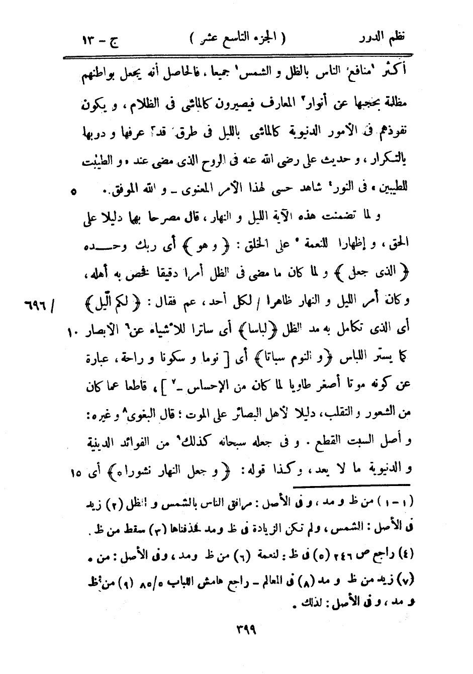 أكثر منافع الناس بالظل والشمس جميعاً، فالحاصل أنه يجعل بواطنهم مظلمة بحجبها عن أنوار المعارف فيصيرون كالماشي في الظلام، ويكون نفوذهم في الأمور الدنيوية كالماشي بالليل في طرق قد عرفها ودربها بالتكرار، وحديث علي رضي الله عنه في الروح الذي مضى عند «والطبيات للطيبين» في النور شاهد حسي لهذا المر المعنوي - والله الموفق.