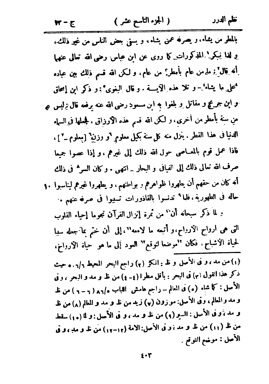 بالمطر من يشاء، ويصرفه عمن يشاء، ويسقي بعض الناس من غير ذلك، ولذا نكر المذكورات - كما روي عن ابن عباس رضي الله تعالى عنهما أنه قال: ما من عام بأمطر من عام، ولكن الله قسم ذلك بين عباده على ما يشاء - وتلا هذه الآية. وقال البغوي: وذكر ابن إسحاق وابن جريج ومقاتل وبلغوا به ابن مسعود رضي الله عنه يرفعه قال: ليس من سنة بأمطر من أخرى، ولكن الله قسم الأرزاق، فجعلها في السماء الدنيا في هذا القطر، ينزل منه كل سنة بكيل معلوم ووزن معلوم، فإذا عمل قوم بالمعاصي حول الله ذلك إلى غيرهم، وإذا عصوا جميعاً صرف الله تعالى ذلك إلى الفيافي والبحار - انتهى. وكان السر في ذلك أنه كان من حقهم أن يطهروا ظواهرهم وبواطنهم، ويطهروا غيرهم ليناسبوا حاله في الطهورية، فلما تدنسوا بالقاذورات تسببوا في صرفه عنهم.